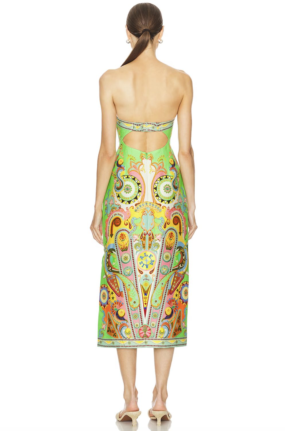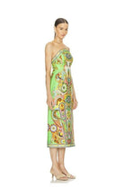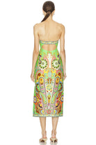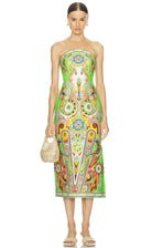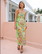 This fitted midi dress boasts a rounded strapless neckline and a striking side split. Complete with an elasticated band at the back bodice and an invisible zipper closure, this dress flatters the femme form.Perfect for summer vacations or as a wedding guest, the vibrant print adds a touch of brightness to your look.