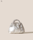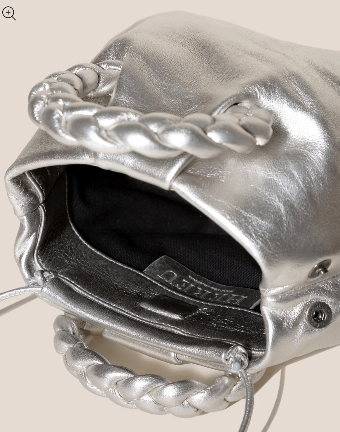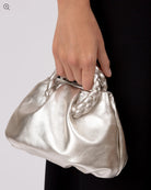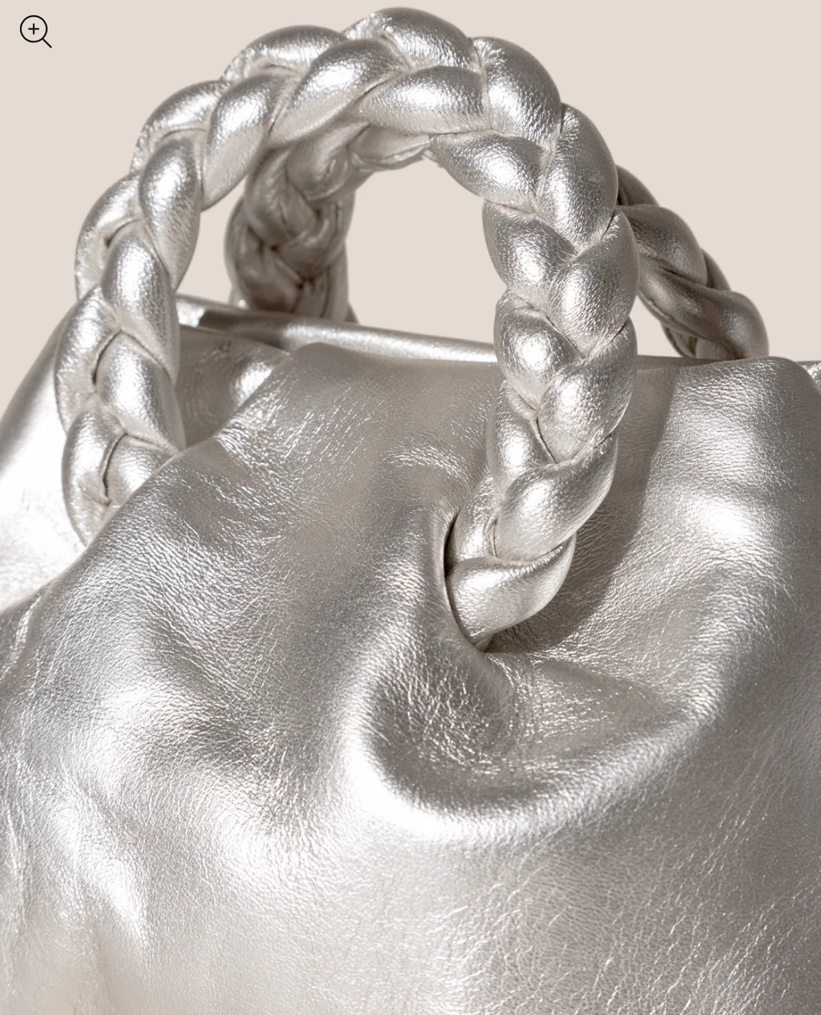 Small metallic leather tote with braided leather handles, crafted in metallic supple lambskin lined with organic cotton canvas.