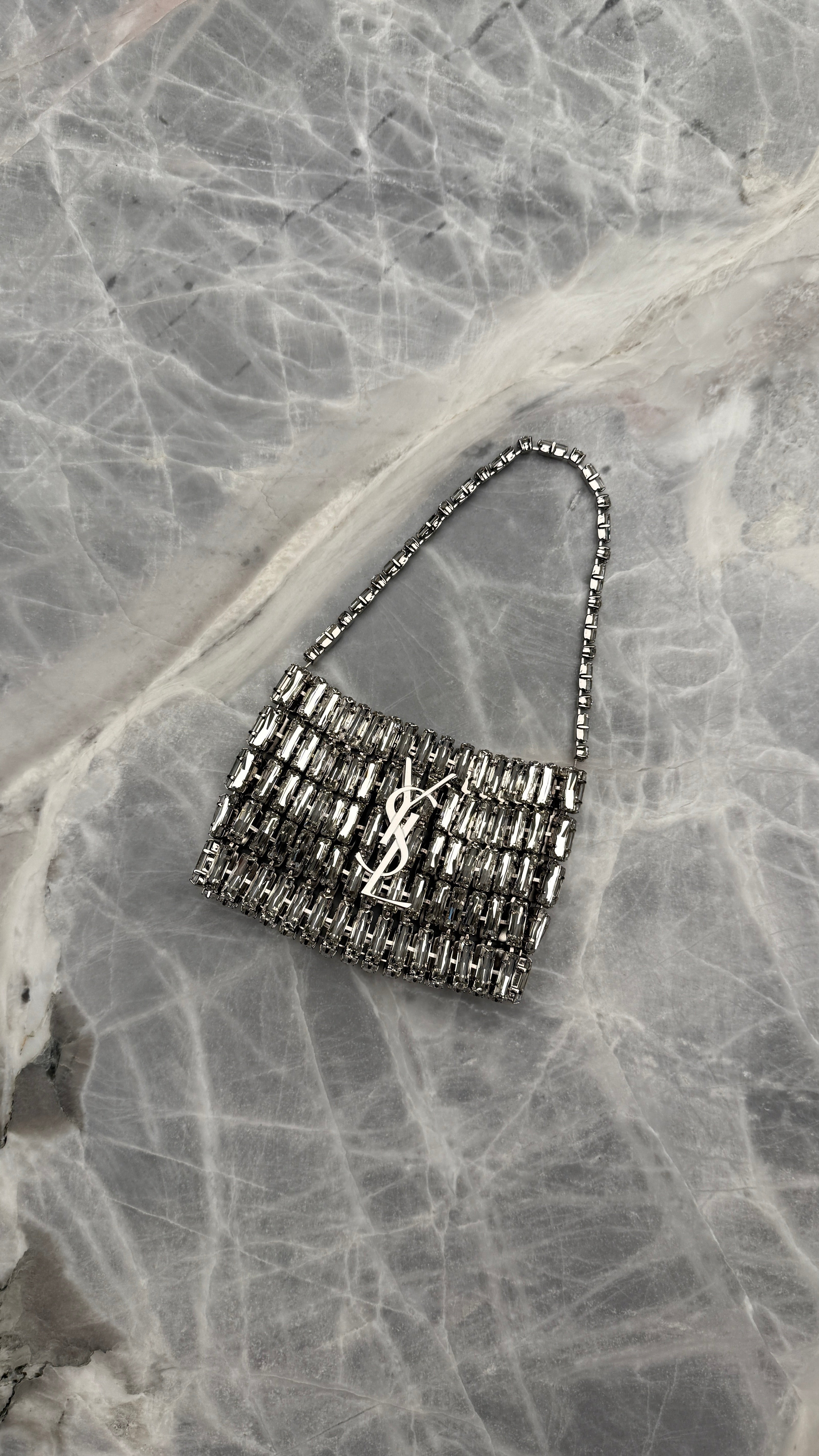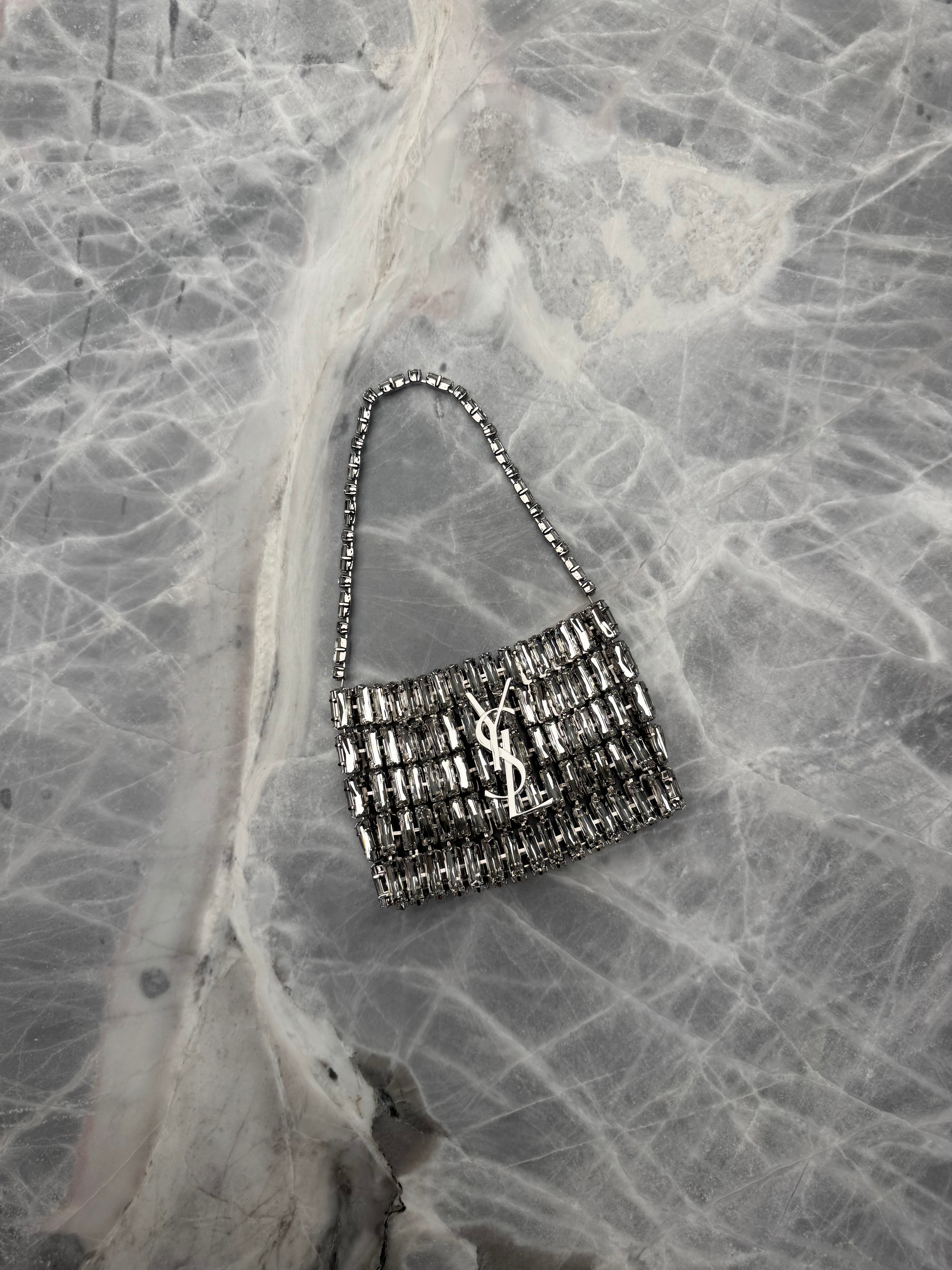 This SAINT LAURENT evening bag is designed to add a statement-making finish to your after-dark edits. Covered in glistening crystals, its softly structured silhouette is topped with a single carry handle and the house's iconic YSL hardware for a distinctive look sure to draw attention.