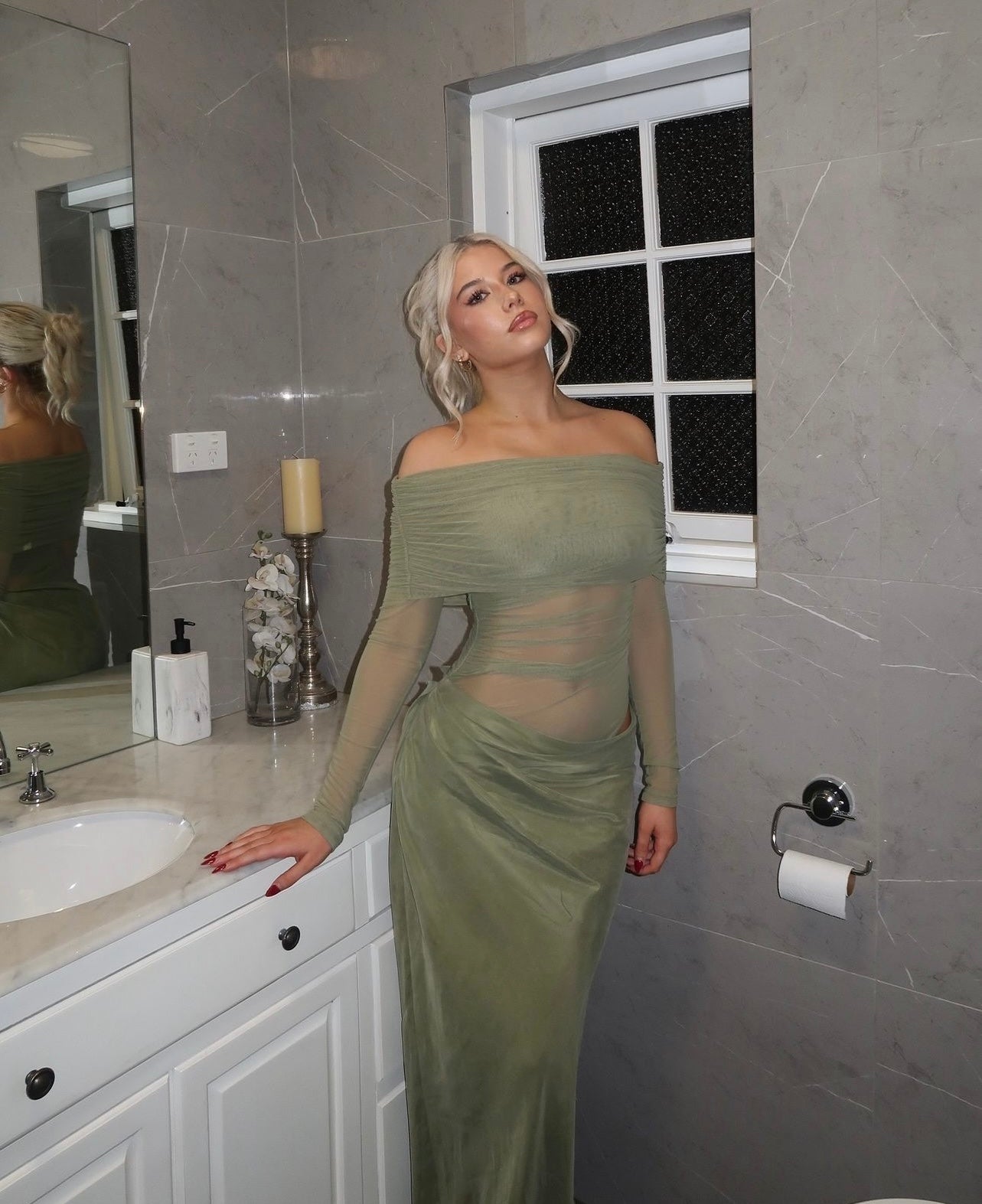 The Yasmin Maxi Dress features a beautiful off-shoulder design with a flattering cowl on the wearers left side waist. The overlapping skirt adds a touch of sophistication while the mesh bodice. Perfect for any special occasion.