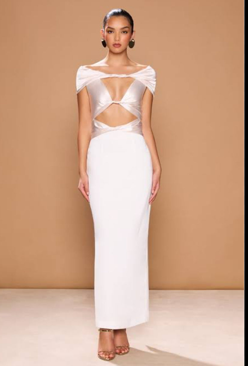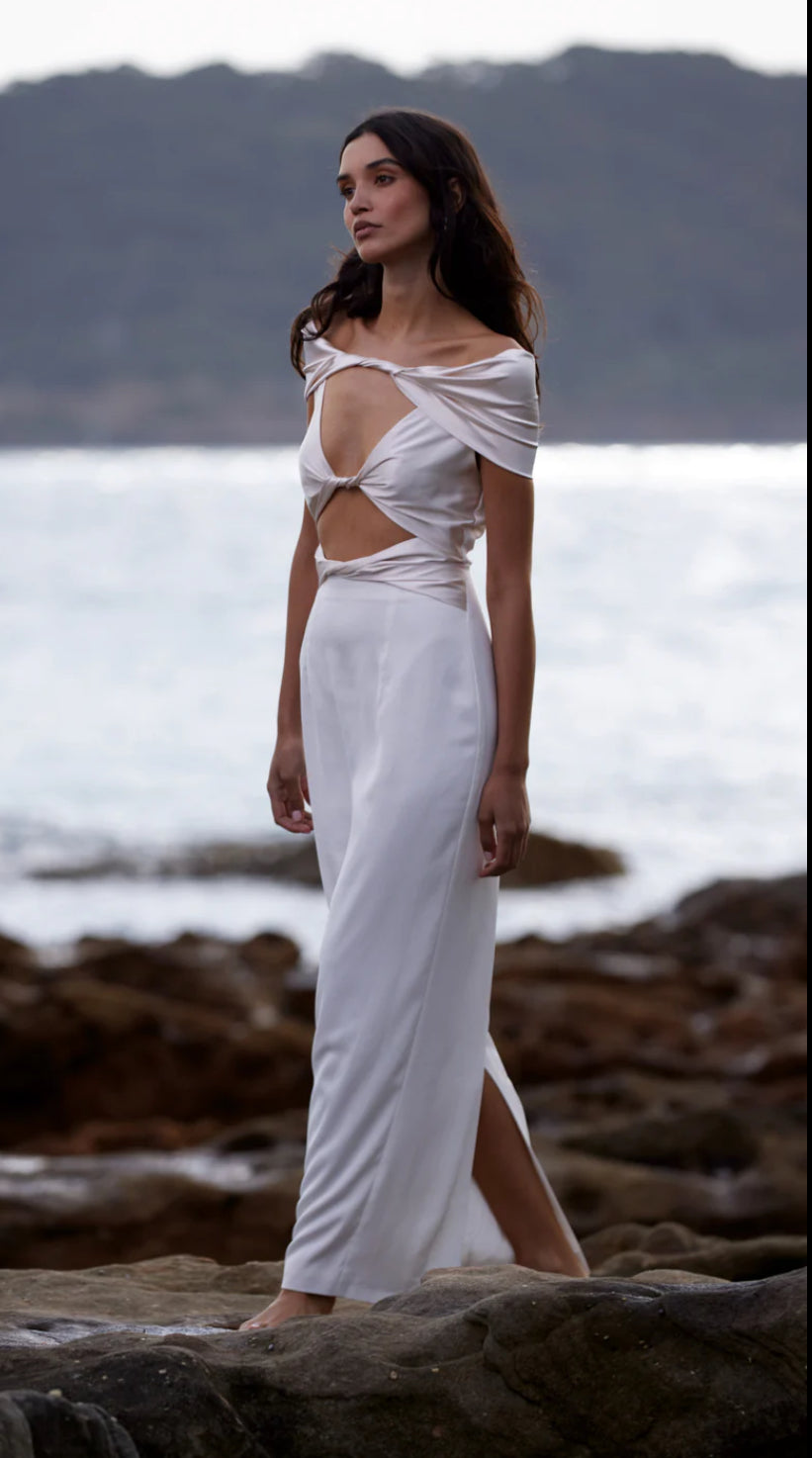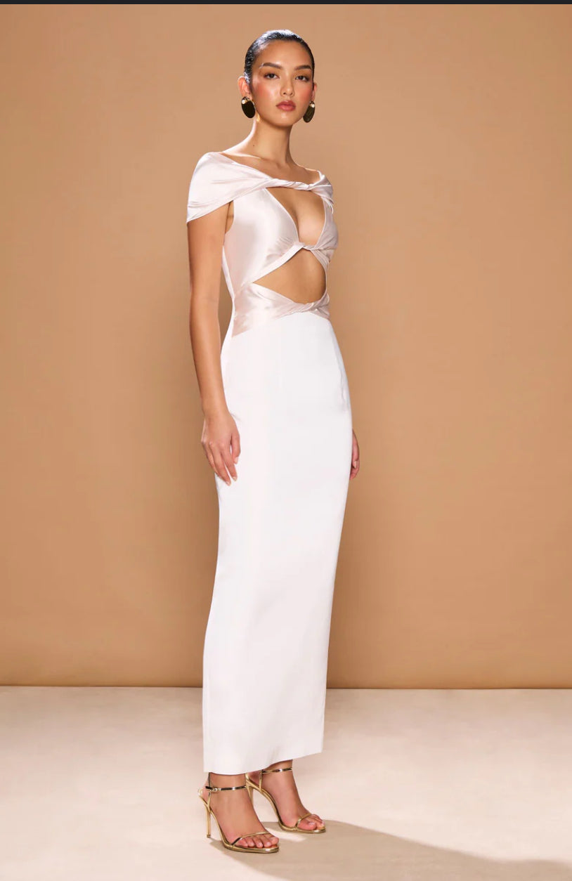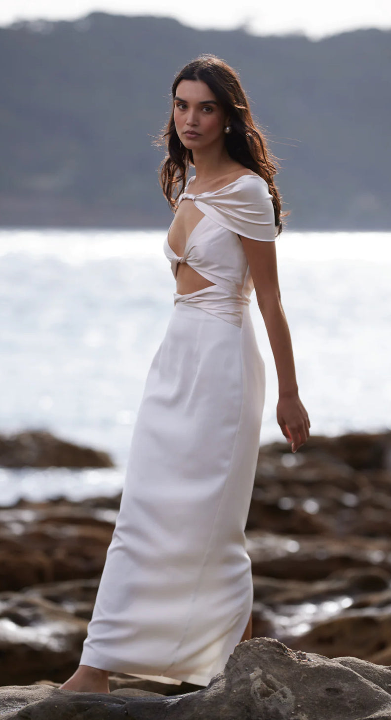 A feminine silhouette designed to hug your curves. The Pisa Dress is an intricate beauty – a statement dress that features a shoulder-baring design and a soft feminine twisted front detail designed for the Italian goddess. This dress features captivating cut-out detailing revealing glimpses of skin for a tantalising effect. The pearl contrasting fabric adds a touch of glamour, creating an enchanting allure that captivates. Striking a perfect balance between sophistication and simplicity.
