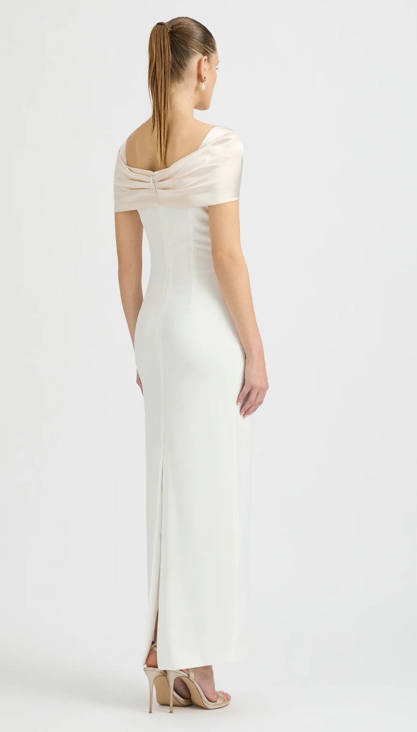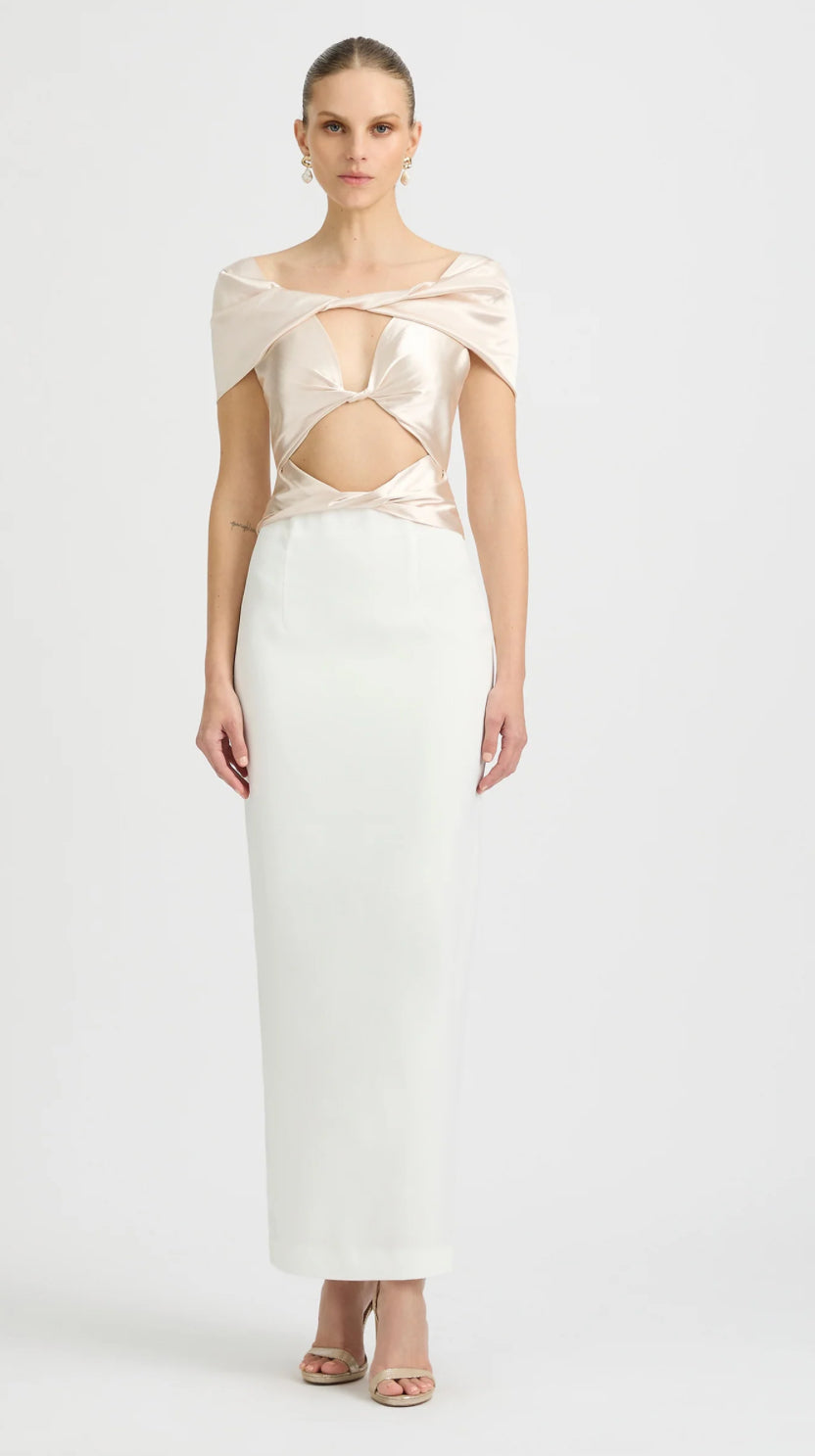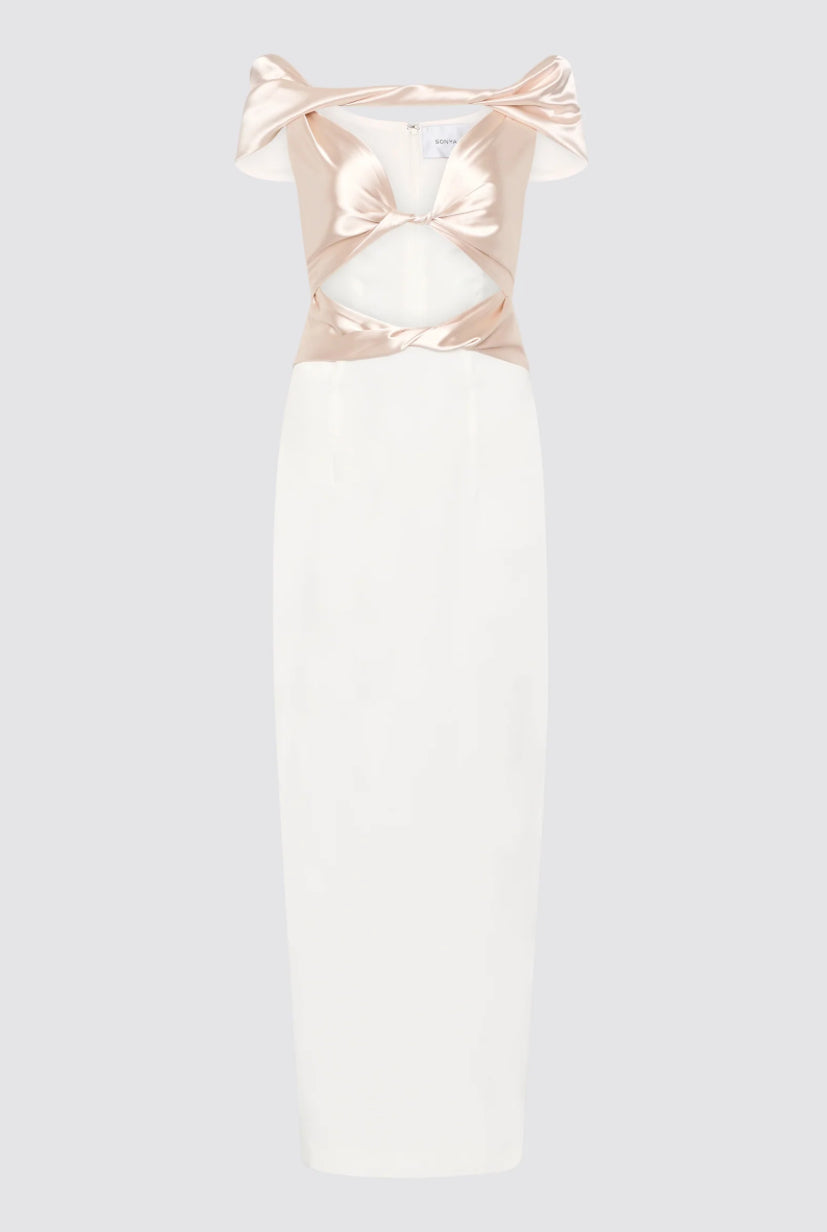 A feminine silhouette designed to hug your curves. The Pisa Dress is an intricate beauty – a statement dress that features a shoulder-baring design and a soft feminine twisted front detail designed for the Italian goddess. This dress features captivating cut-out detailing revealing glimpses of skin for a tantalising effect. The pearl contrasting fabric adds a touch of glamour, creating an enchanting allure that captivates. Striking a perfect balance between sophistication and simplicity.