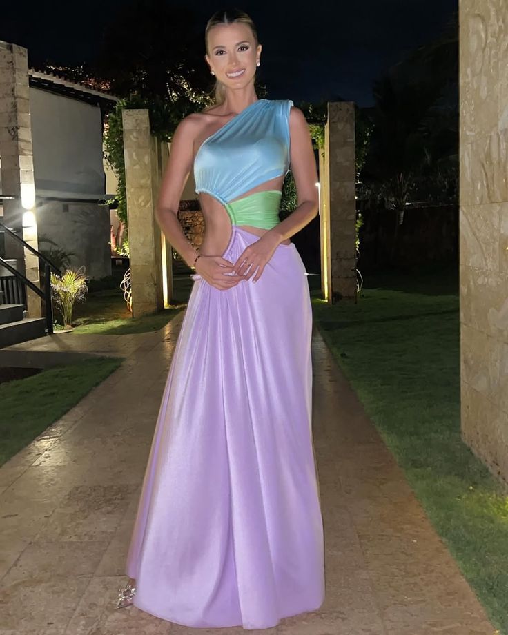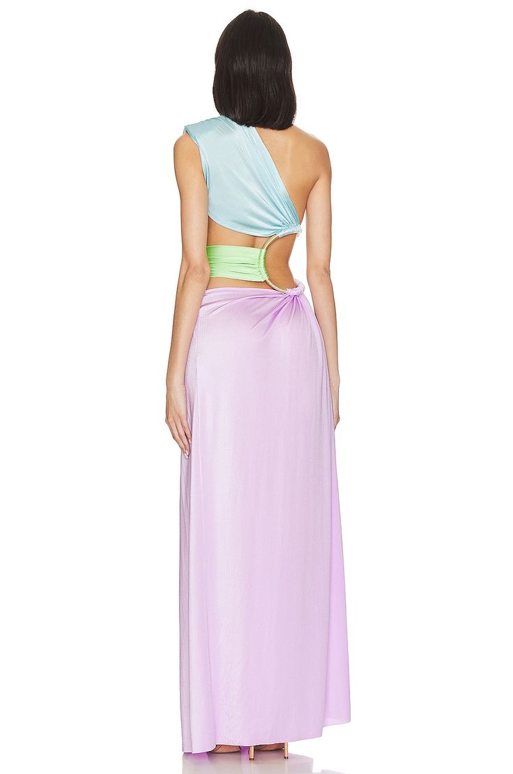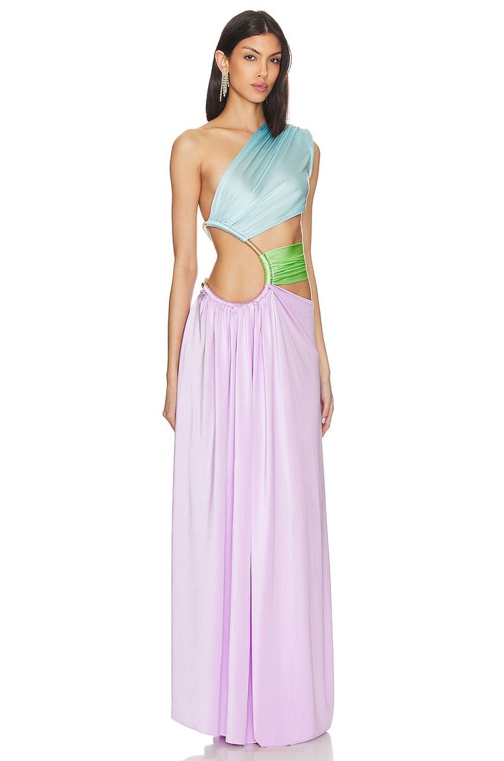 The Jamilia One Shoulder Gown by Bronx and Banco is a sophisticated and chic dress known for its one-shoulder design and cutout details. It often features a gold-tone ring hardware connecting the cutouts, a side slit, and is made from a stretchy, lightweight fabric.