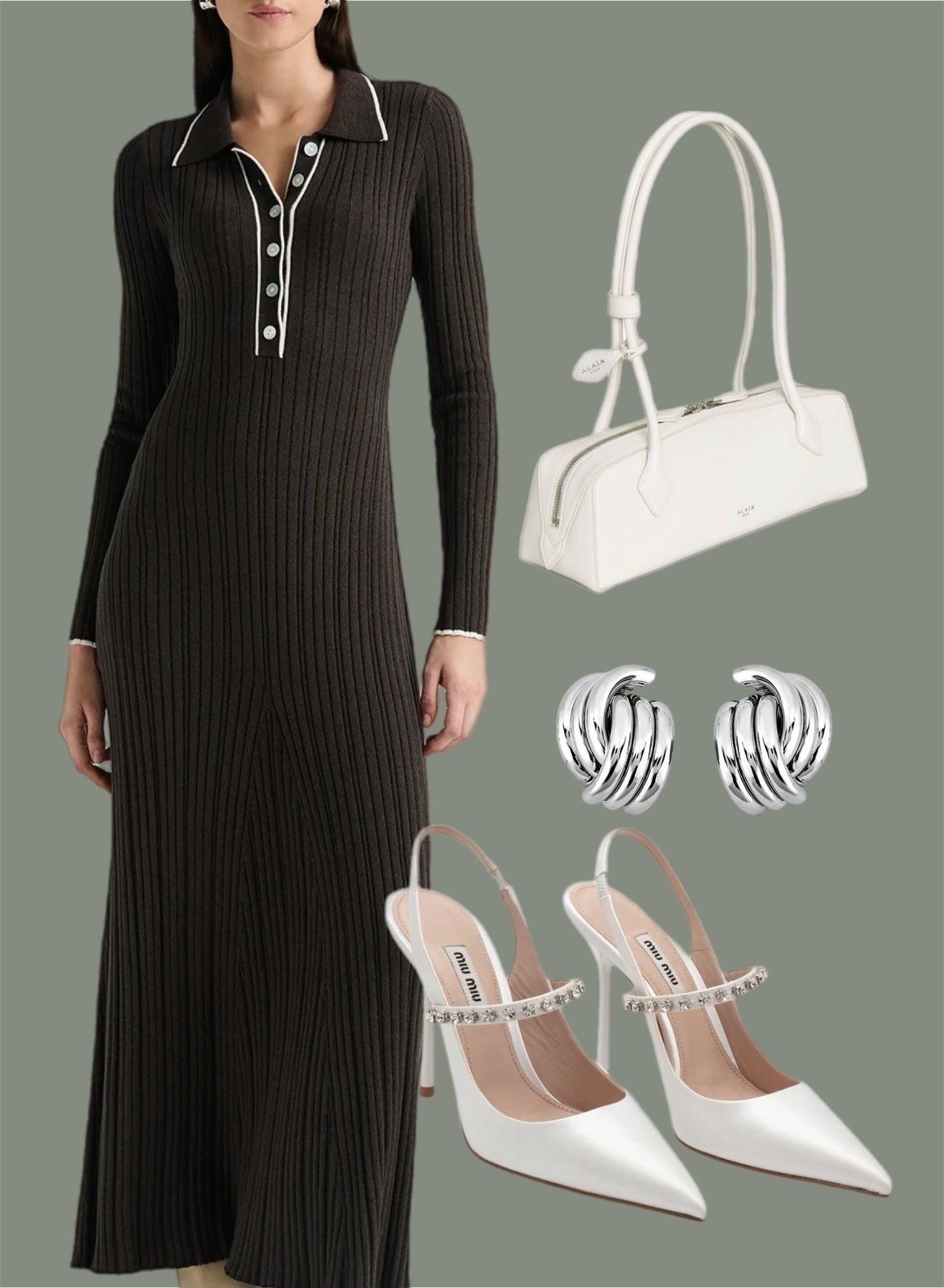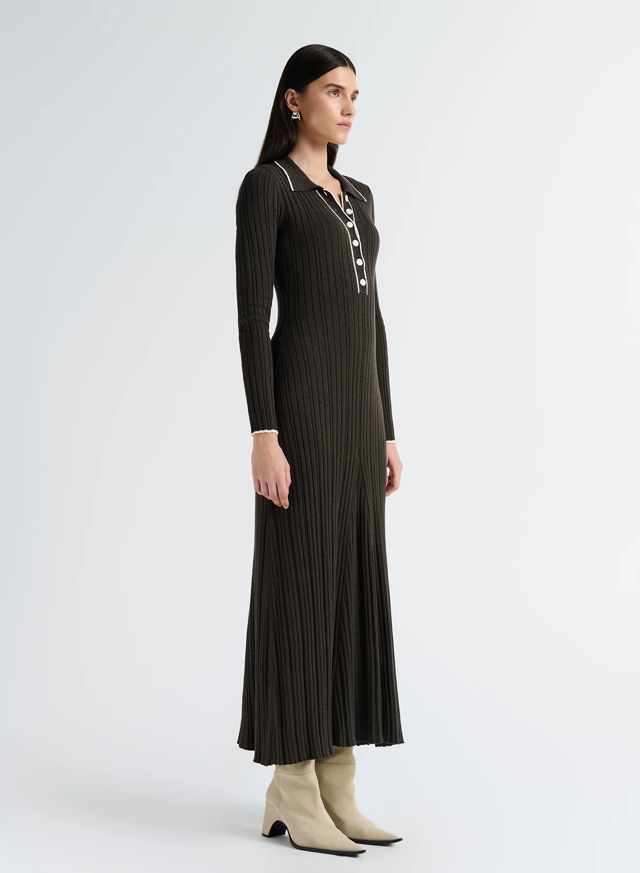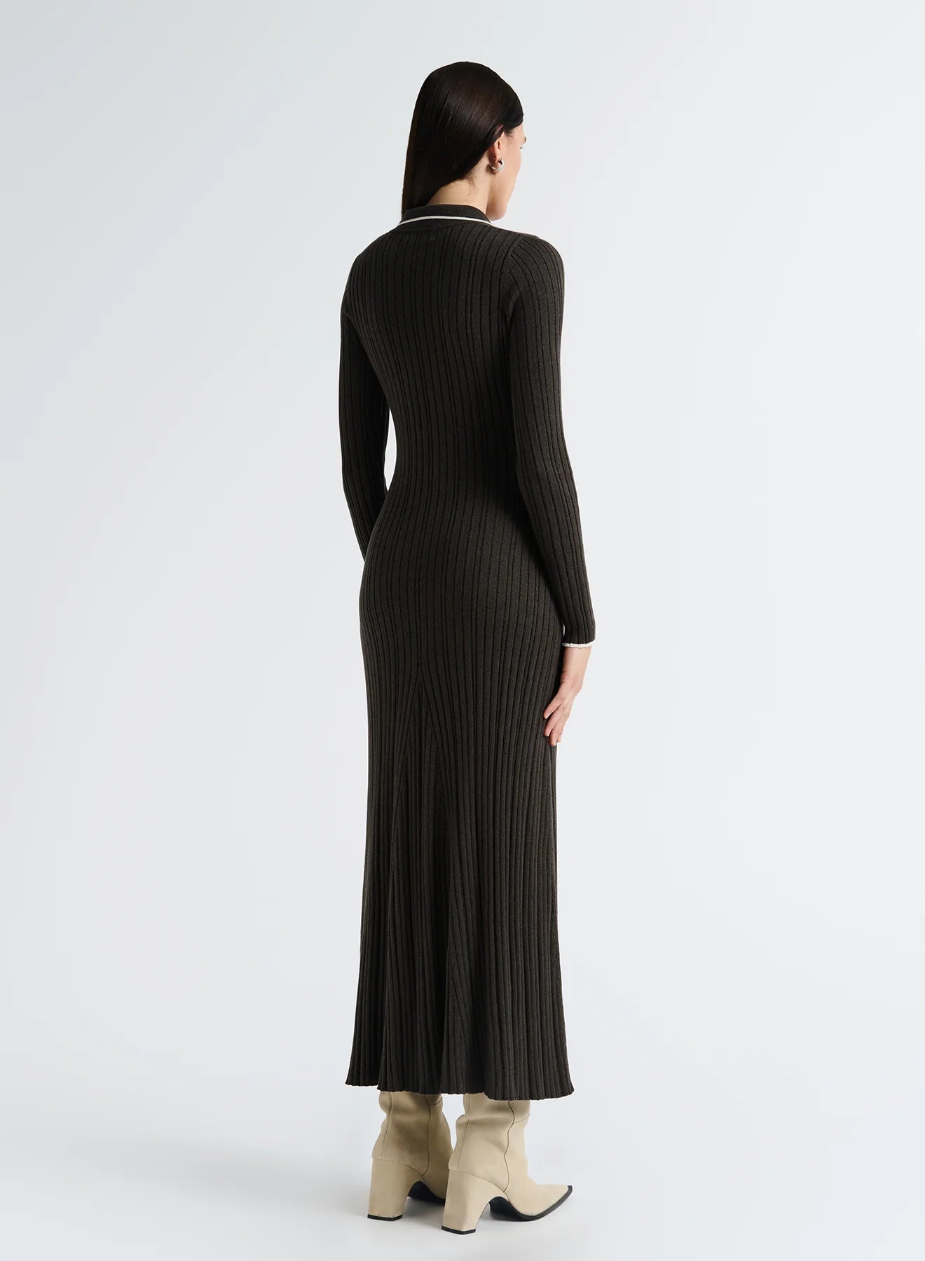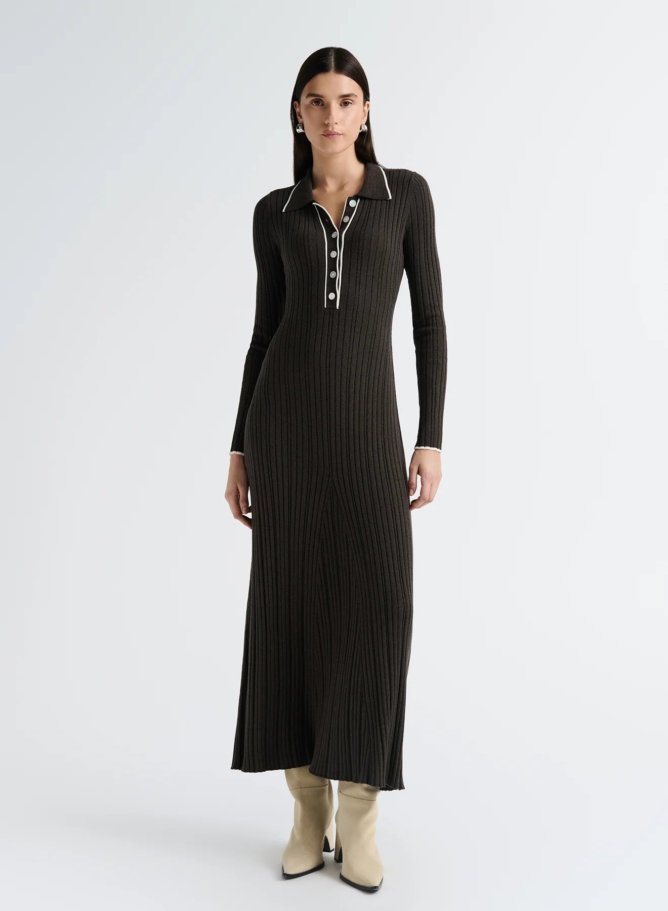 The Angelina Dress is a long sleeve knitted midi dress. Designed with Anna Quans signature polo neckline, contrast trimming and full length sleeves. Knitted in a breathable 100% cotton fabrication that showcases a long silhouette that falls from the hips into a softly flared A-line hem