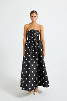 The Dottie Strapless Midi by PASDUCHAS is crafted from a lustrous-finish taffeta and features an exclusive black and cream polka dot print. This strapless silhouette is defined by textural tucks through the bodice that enhance and flatter the shape, while a structured waist seam cinches the figure before falling into a full, voluminous midi-length skirt. Functional side pockets add a modern, practical touch. Lined through the bodice and finished with a centre-back zipper, this style is ideal for statement event dressing.