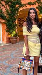 Meet the Nico Mini Dress, featuring an off - shoulder design crafted from a lightweight stretch mesh and flattering cupro skirt with a cowl on the left side waist. The overlapping skirt and mesh bodice creates depth, with the option to show more skin on the wearers left hand side waist.