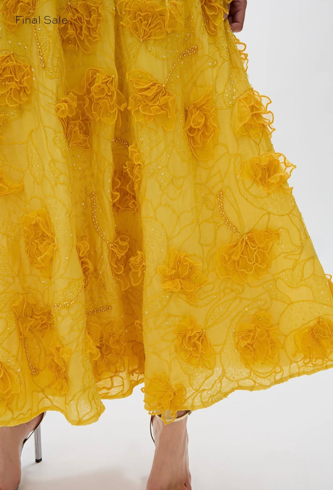The lanthe Dress features a feminine silhouette with a one-shoulder tie adorned with hand placed embroidered floral motifs. Fitted through the bust and waist before falling to an a-line silhouette complete with 3-D flowers and hand embroidered & beaded embellishments.