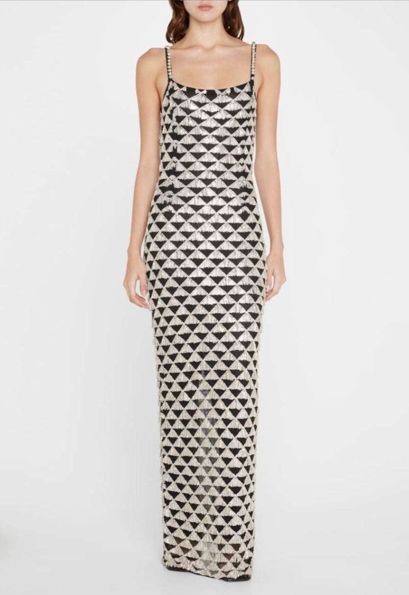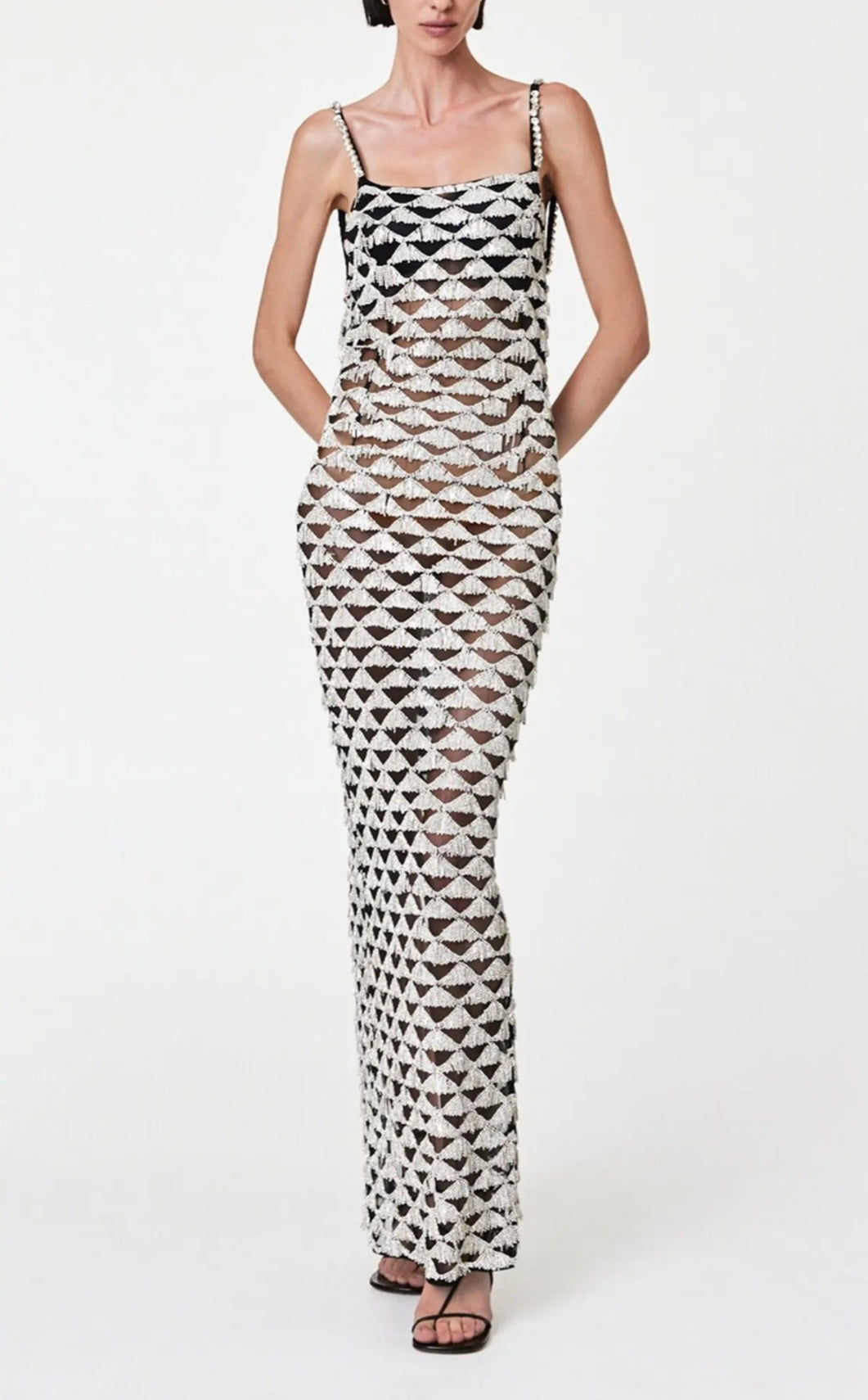 Featuring all-over crystal embellishment and delicate fringe detailing, lending a shimmering, tactile finish from top to hem.