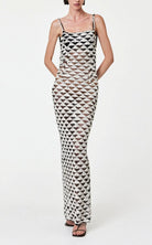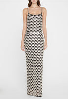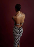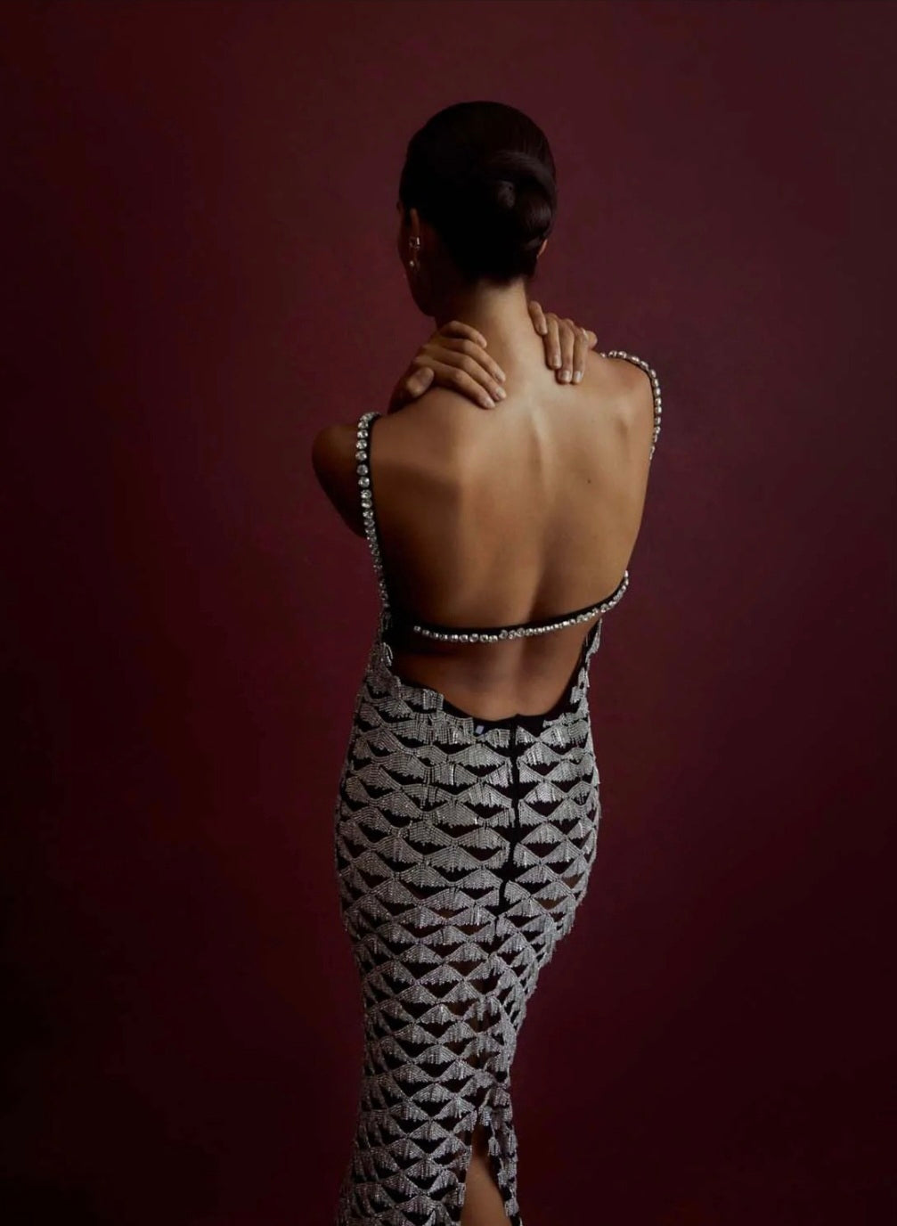 The design is tailored to be form-fitting with a hint of stretch for ease of movement and a confident fit. The gown is supported by slender spaghetti straps, leads into an open-back finish, and falls gracefully to the floor.