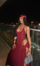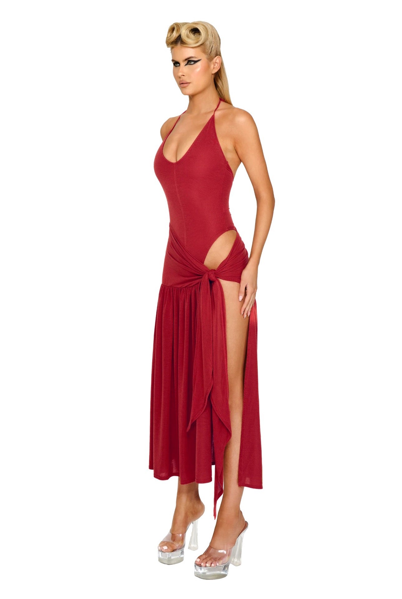 Halter plunge bodysuit with conjoined skirt piece, crafted in double layered luxurious knit. Tie at the side to reveal as much as you want.