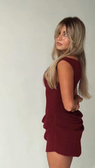 Signature shape, drape dress. In a deep wine red, the perfect autumn winter dress. Features a front and back drape and a slim bodice, cinched waist to enhance your figure.