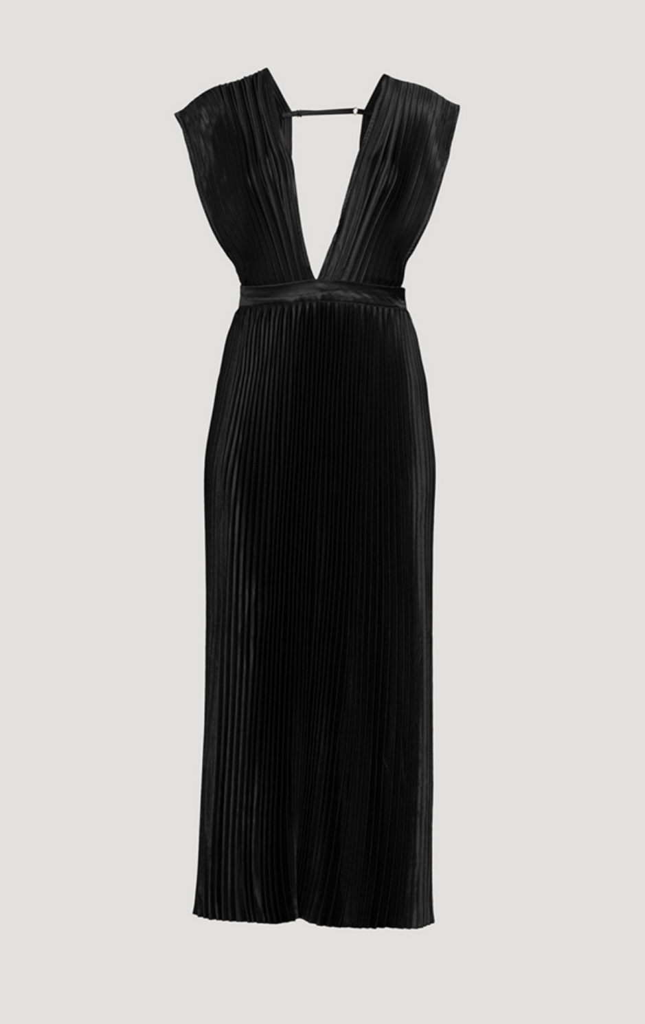 A statement silhouette, the Gala Gown in Noir, is a midi length silhouette crafted from L'IDÉE's signature ribbed pleating. Featuring an eye catching plunging V neckline, this midi dress is fitted at the waist with an invisible centre back zip closure and falls into a signature umbrella pleated skirt that finishes at ankle length.