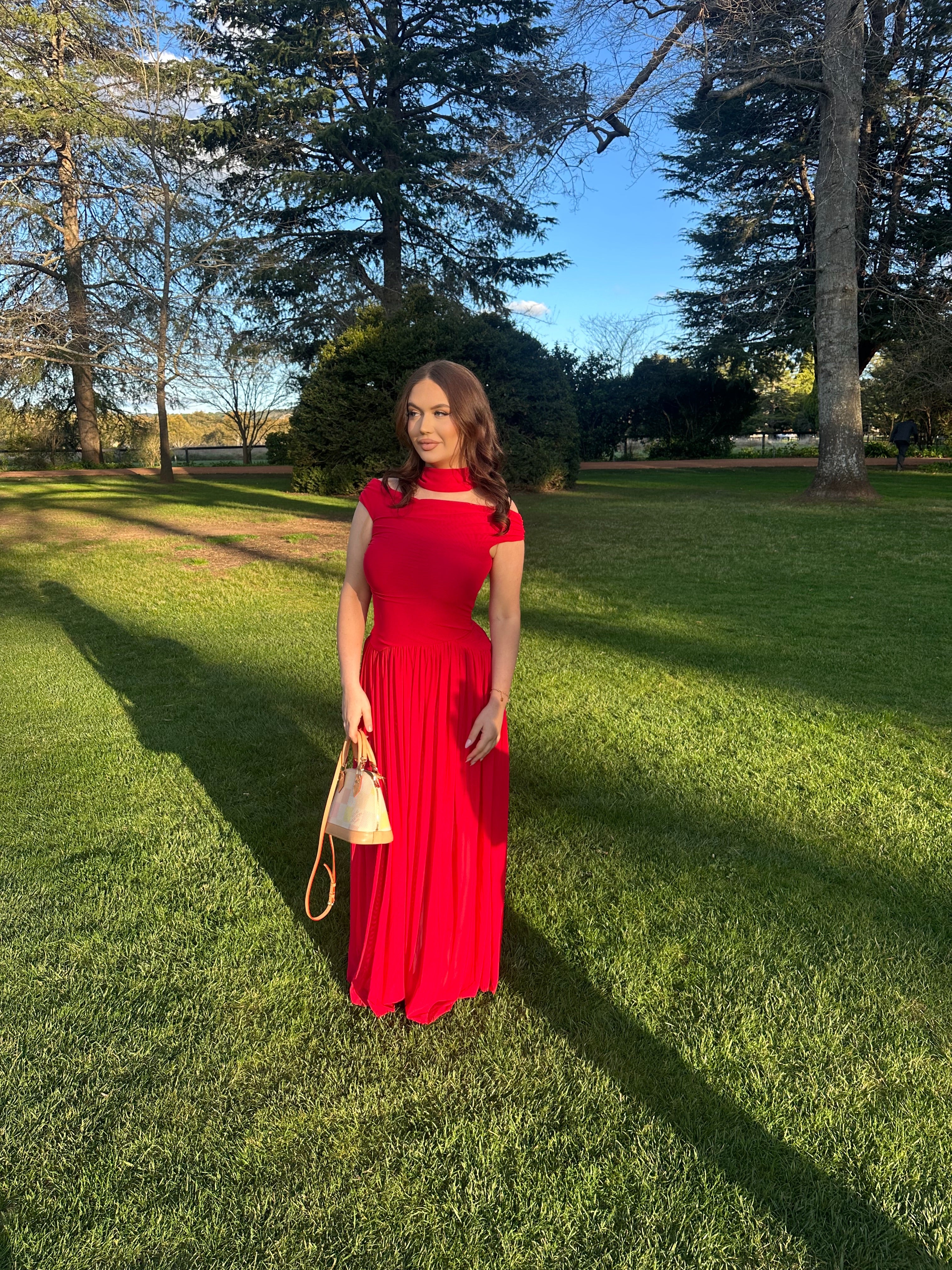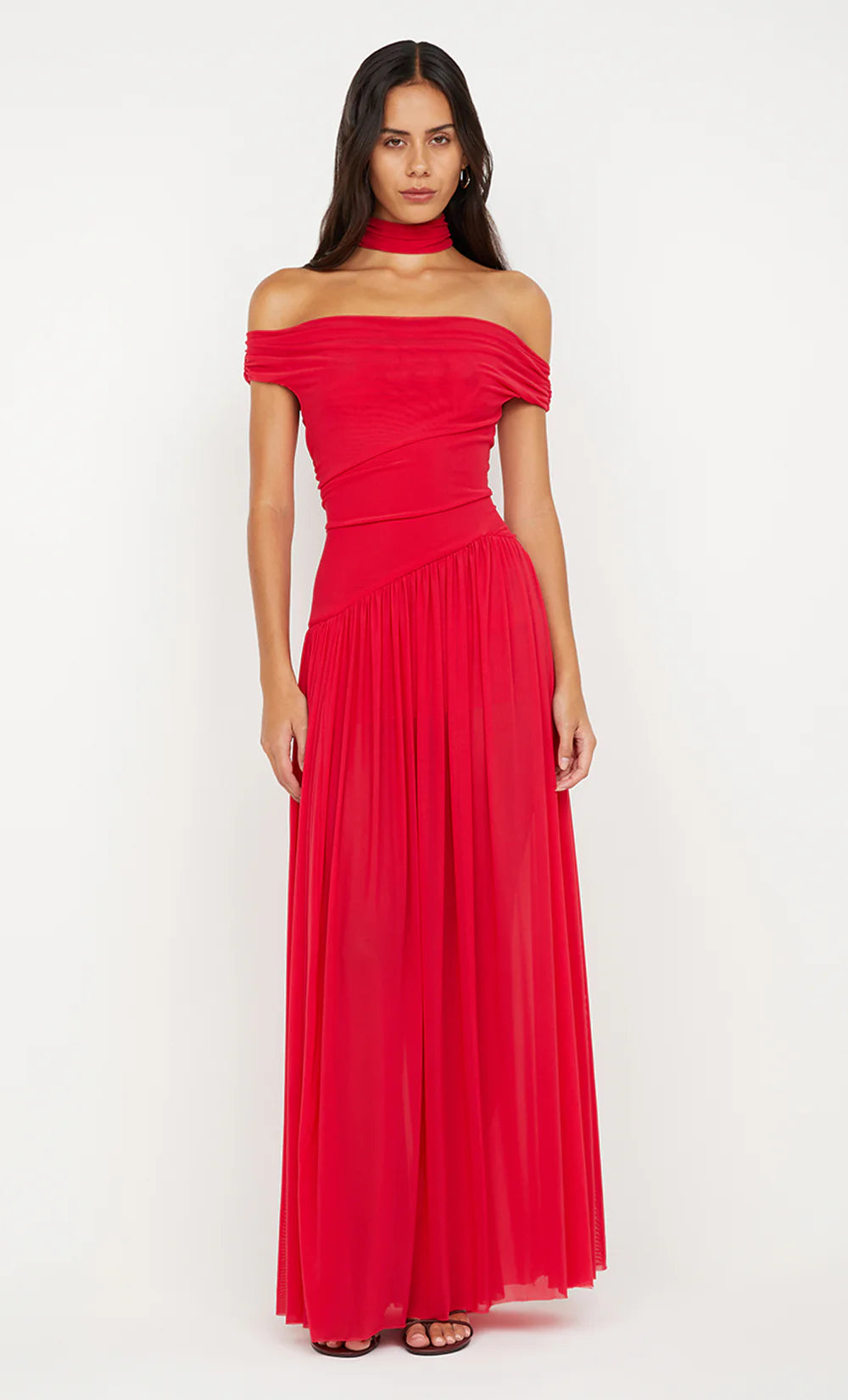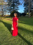 Deija Off-Shoulder Maxi Dress in Strawberry. The perfect maxi dress for your next event, formal or wedding.