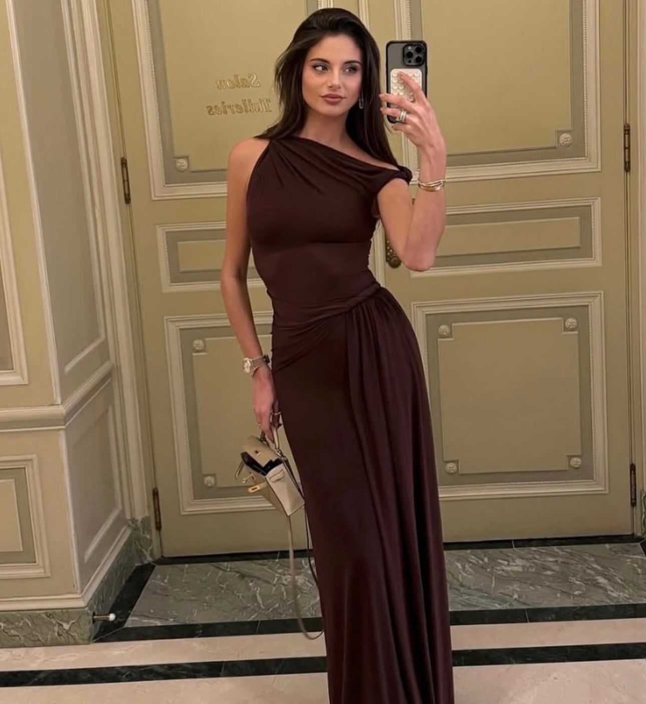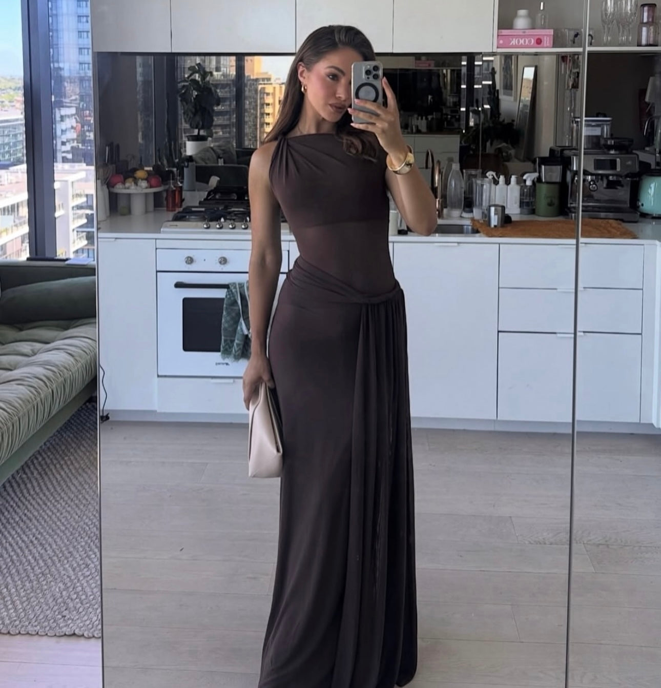 Gorgeous Misha maxi dress with mesh detail in expresso colour