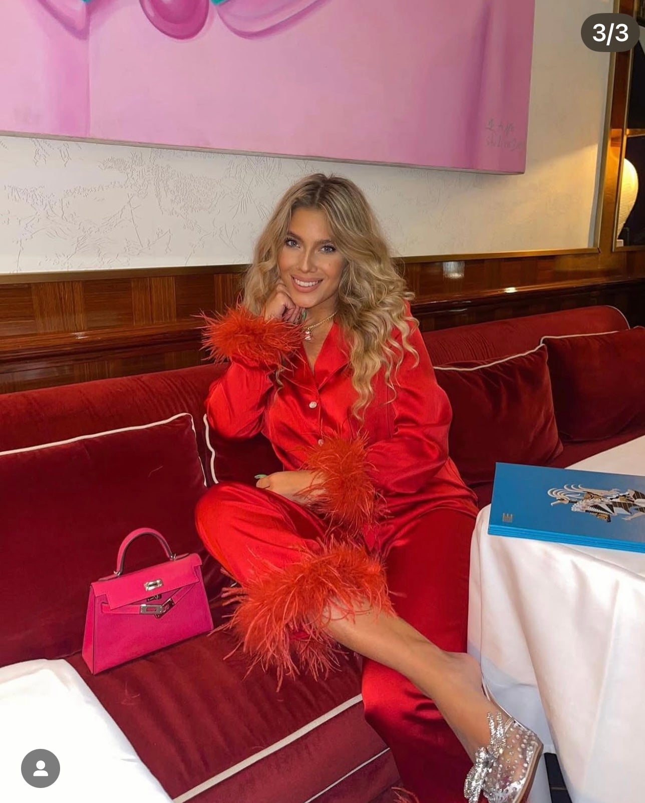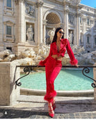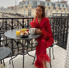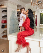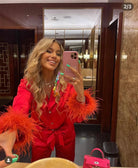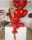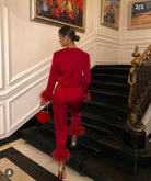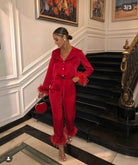 Iconic MERABI Pyjamas .The DARCIE red Pyjamas. These red silk touch pyjamas are designed to feel as good as they look, with a smooth silk touch material and a soft feather trim at the cuffs. The red satin binding on the shirt and trouser hem cuff gives a luxurious feel, while the diamante buttons add a touch of decadence.