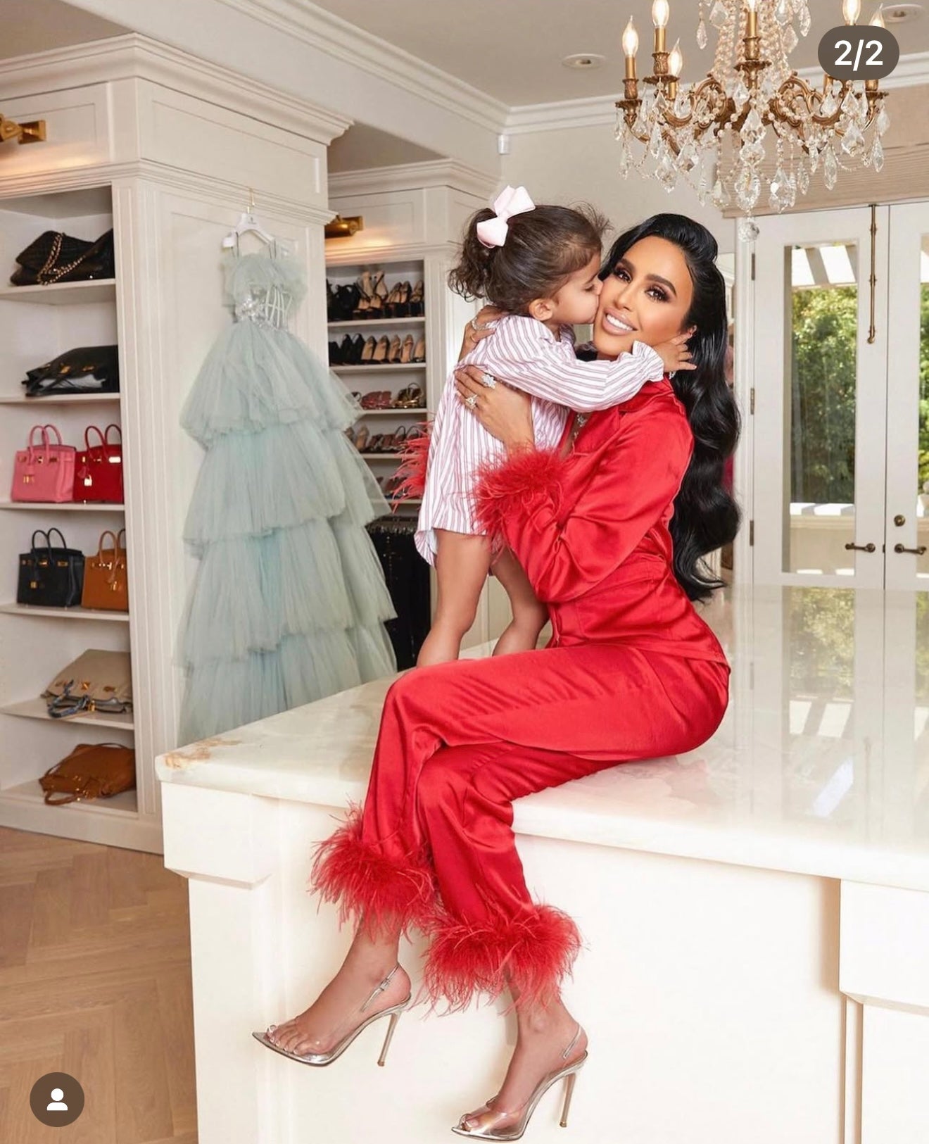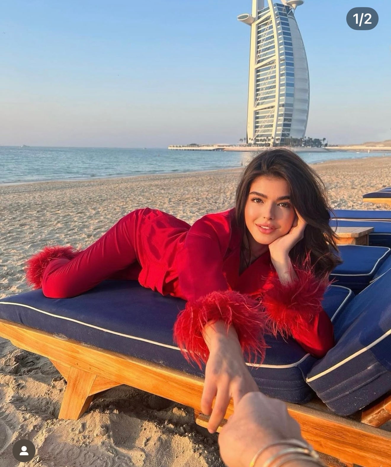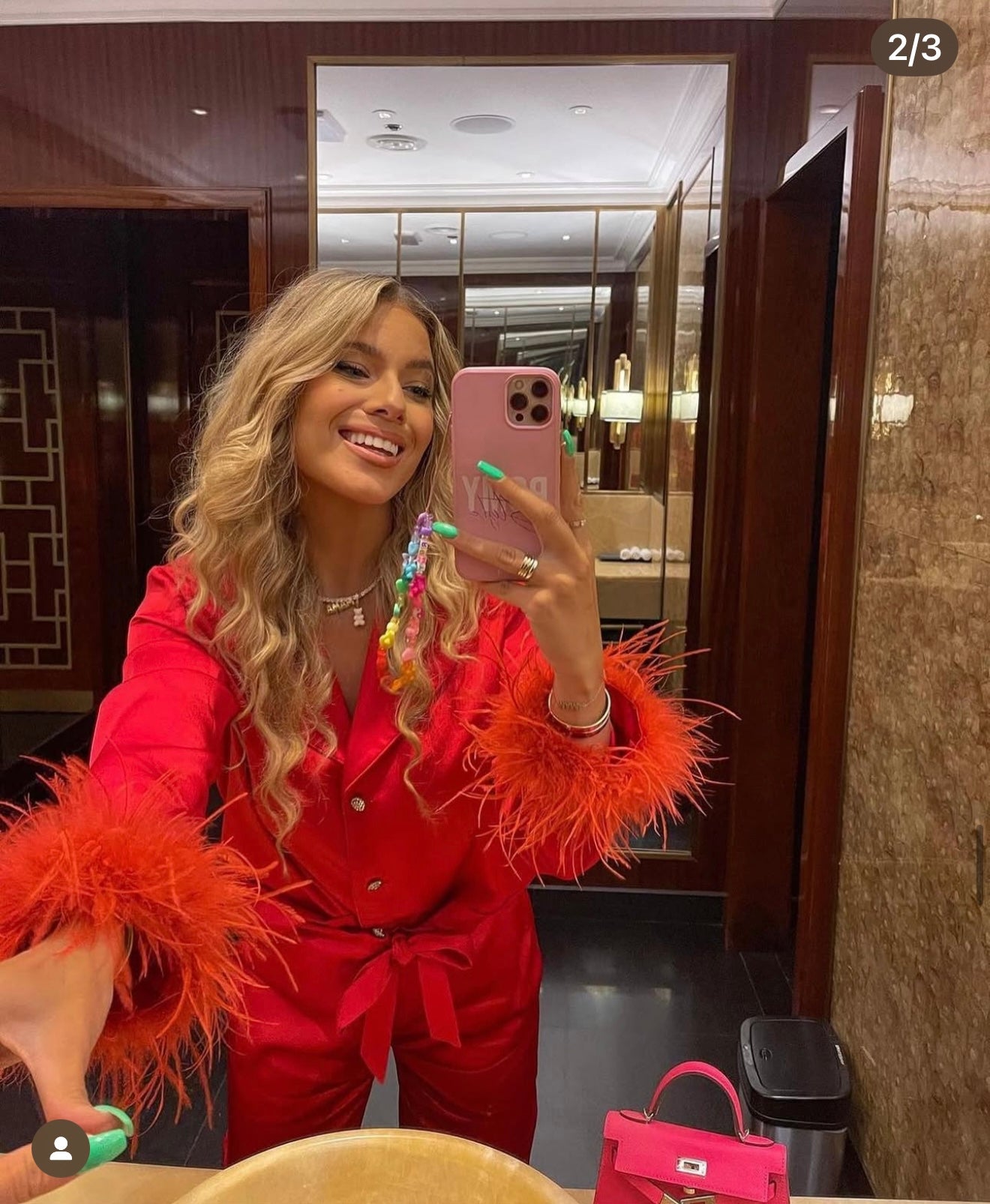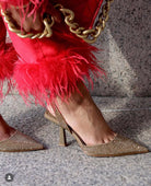 Feather cuffs on bottom of pants and arms of top