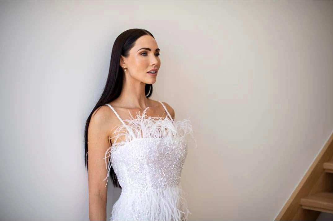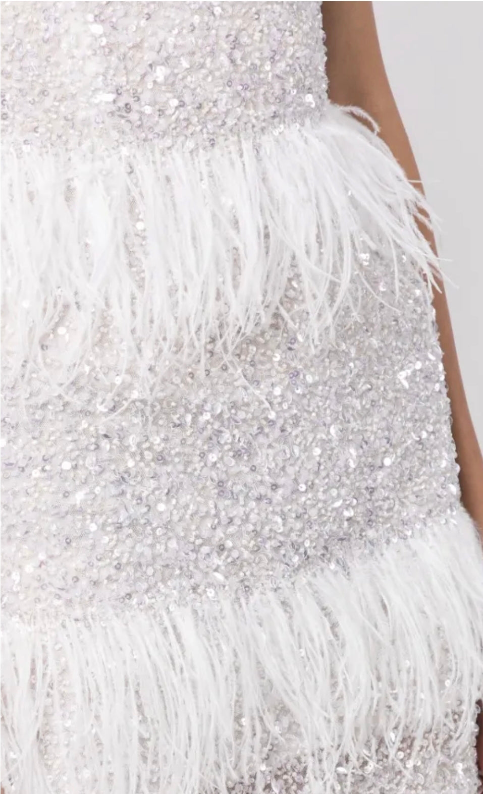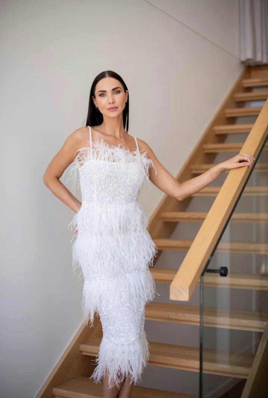 A standout silhouette, the Frenchy boasts signature Rachel Gilbert detail, featuring hand embellishment complete with layer feather panels throughout. This is a slim-fitting silhouette, designed to hug the natural curves of the female form complete with a flattering square neckline