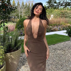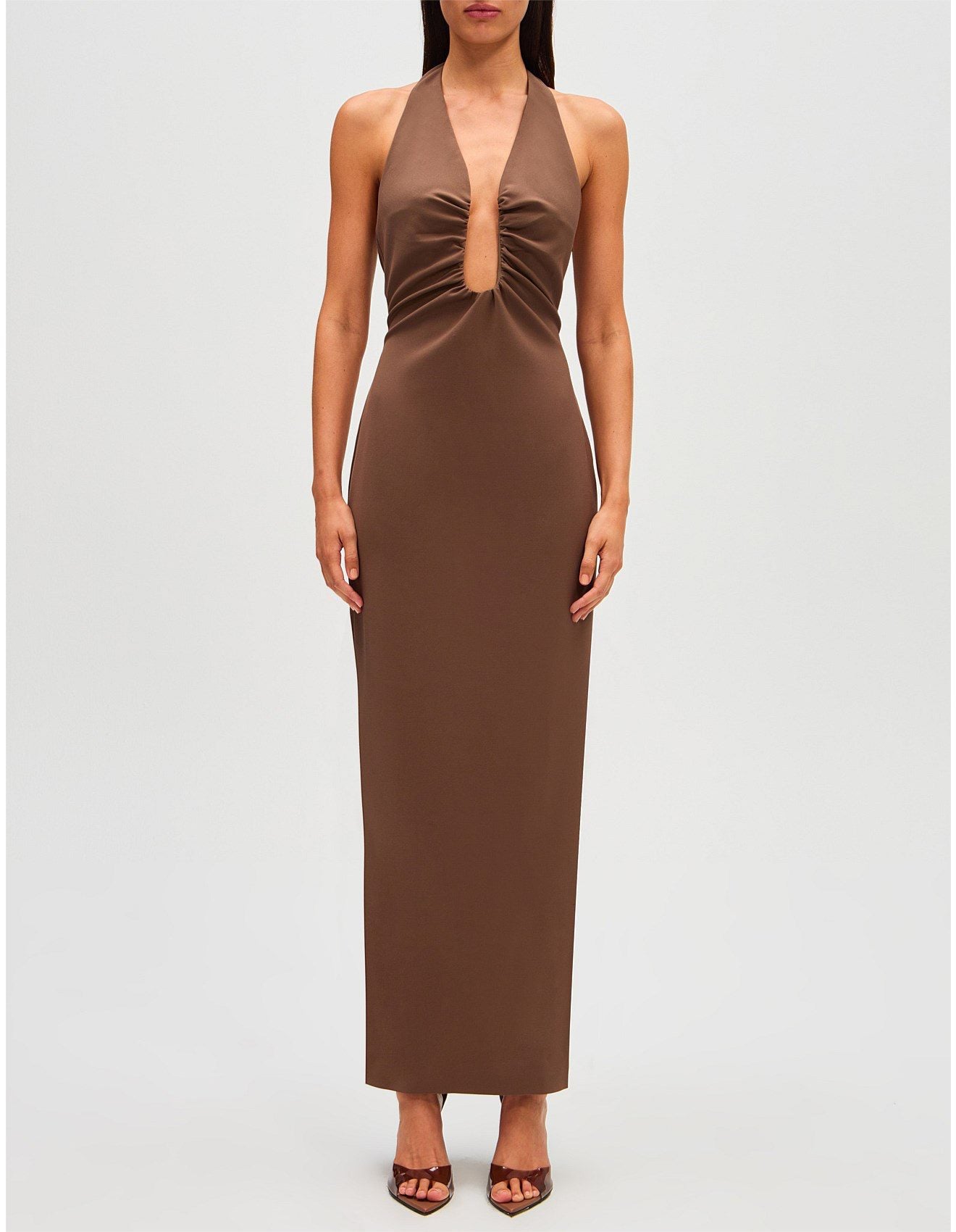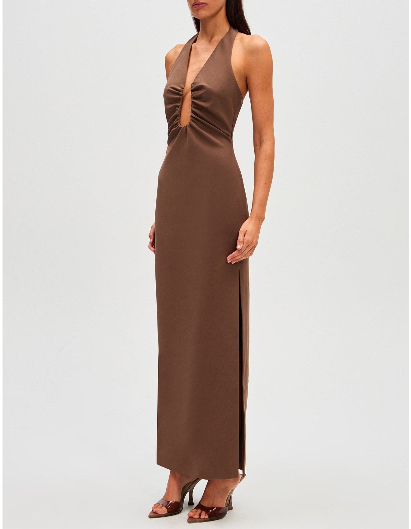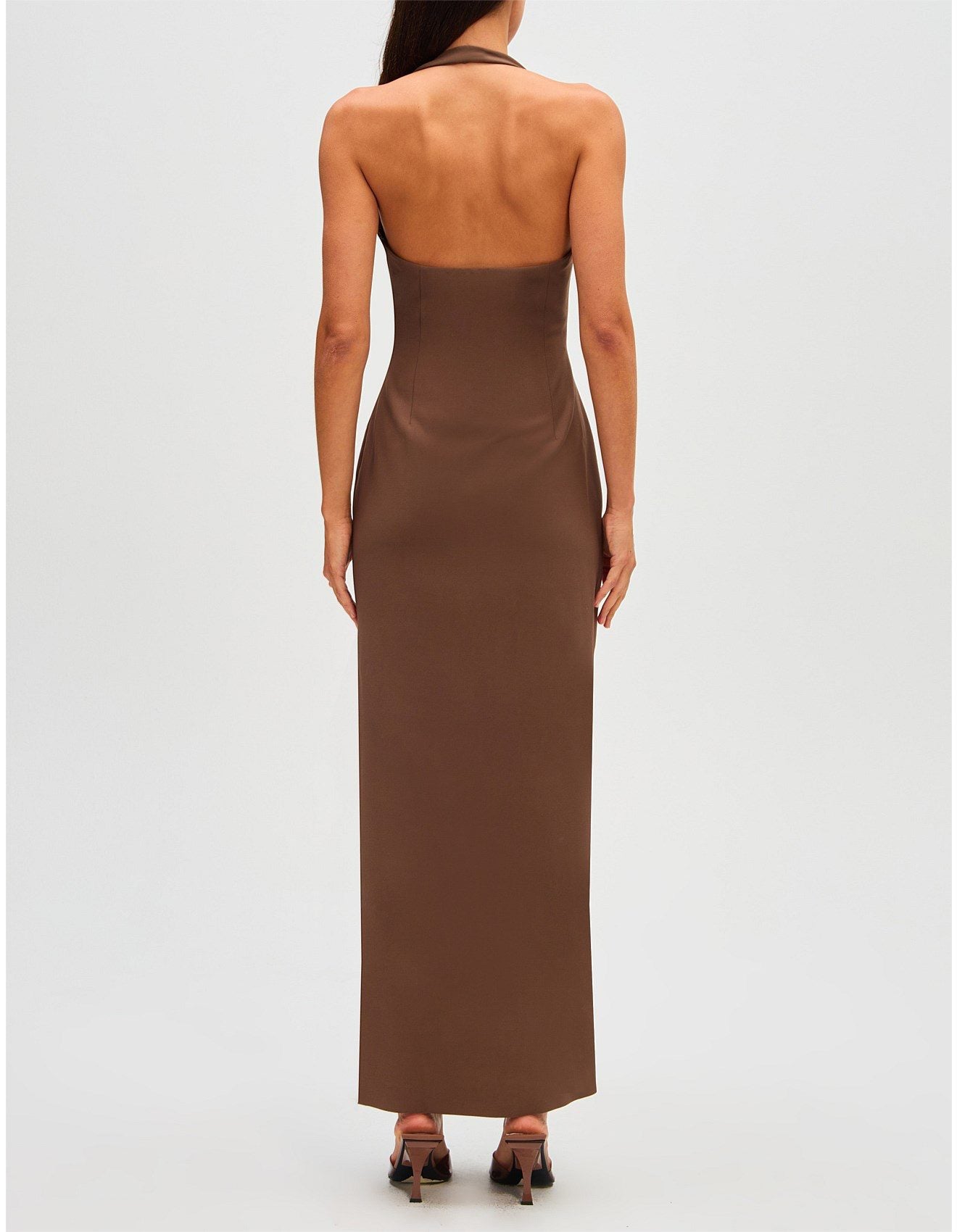 -Boned bust cutout-Side split on left side seam-Halter neckline-Back princess seams for shaping-Slim fitting maxi dress