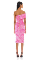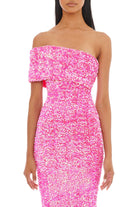 The Alyssa Dress is designed in a richly embellished sequin and features a flattering bodycon silhouette and asymmetrical one shoulder neckline. Complete with lining and a centre back exposed metal zipper, this piece will draw attention and your next special event.