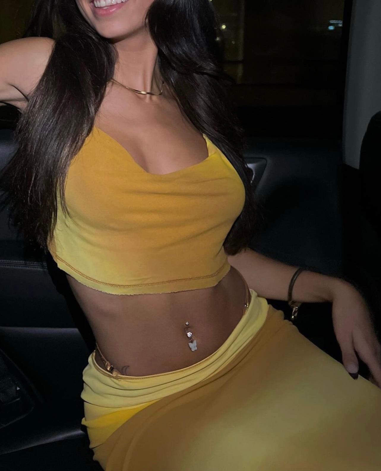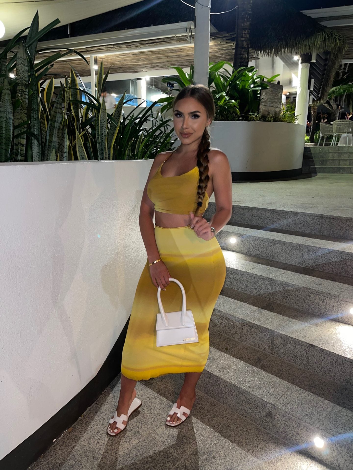 • NOTE: the photos provided show a bigger size skirt, the size 6 is a little more of a midi length (please see second image for more accurate fit)The Amara Halter Top is cut from a statement ombre fabric. The cowl neck, halter top is detailed with adjustable straps at the neck, torso and waist that feature metal o-rings at a flattering open back.The Amara Maxi Skirt is cut from a statement ombre fabric. The easy-to-wear style sits at a mid-high waist and skims along the body into a maxi length. The skirt is detailed with cover-stitch detailing at the top edge, a raw hem and a statement adjustable elastic strap with metal o-ring hardware around the waist.
