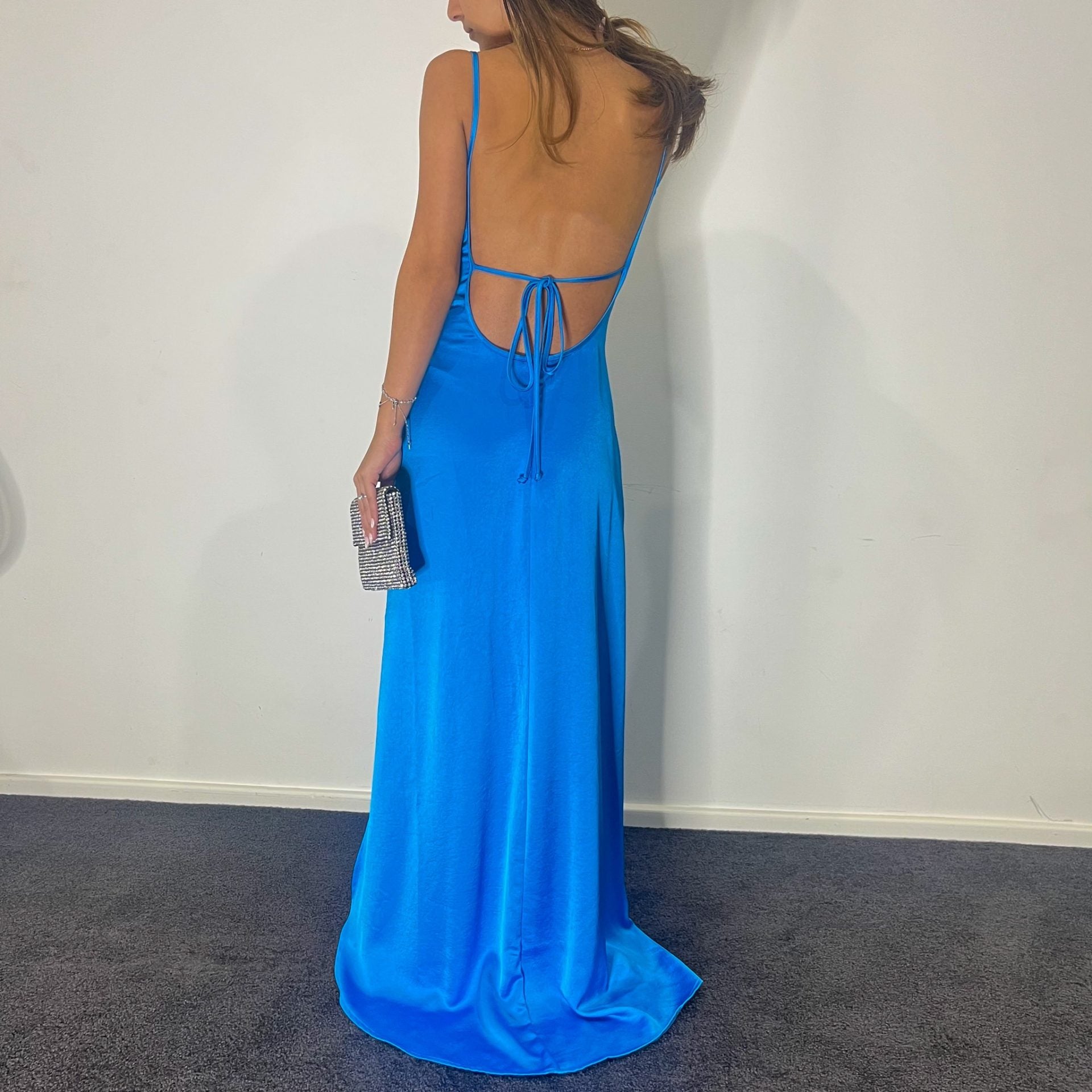 A stunning silhouette that drapes over your frame and cascades into an open maxi skirt that elegantly flows as you walk. Featuring a deep plunge low back secured with satin bias ties to cinch your waist