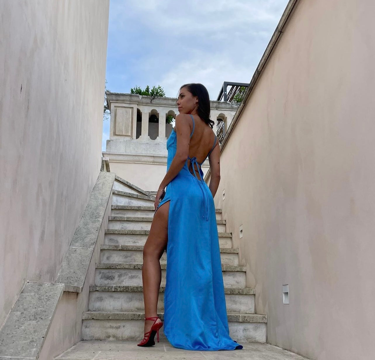 “Inspired by a afternoon by the ocean, Amari is the perfect dress to take you through the heat of summer. A stunning silhouette that drapes over your frame and cascades into an open maxi skirt that elegantly flows as you walk. Featuring a deep plunge low back secured with satin bias ties to cinch your waist & compliment your figure in all the right places. Finished with French seams in a lustrous blue satin, Amari is made for effortless sunset-infused nights”