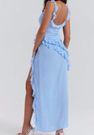 Features a draped cowl neckline, thigh-high split and fluttery ruffle detailing. Fabric has minimal stretch.