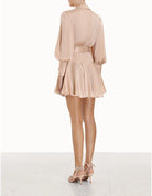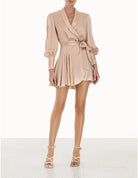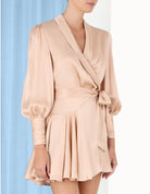 The Silk Wrap Mini Dress in Creme from our Spring 2022 Collection. This silk midi dress has a wrap front silhouette and fluid asymmetric skirt.Sandwash silk miniWrap frontAsymmetric ruffled mini skirtBlouson sleeves with button down deep sleeve cuffs