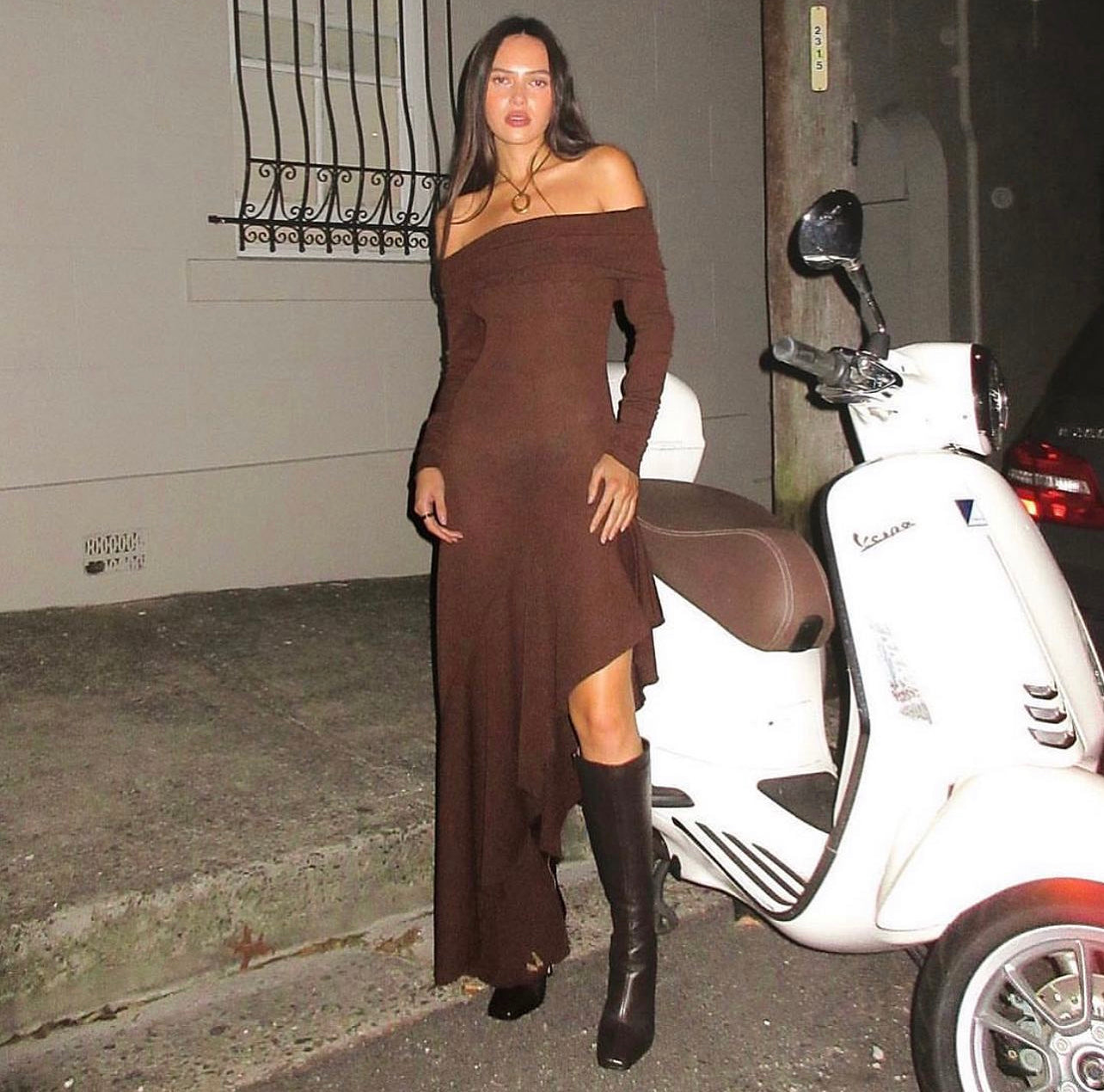 a timeless classic that embraces the essence of the cooler seasons. Crafted from a sumptuous lightweight knit in a rich brunette hue, Bella embodies style and purpose. With versatility at her core, she’s designed to effortlessly transition from casual daytime outings to elegant cocktail hours. Her flawless slim fitting silhouette gracefully flows into an asymmetrical skirt, featuring a bias cut frill for an elevated touch. Complete with a contemporary off-shoulder neckline, Bella is a wearable statement for your winter wardrobe.