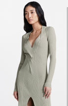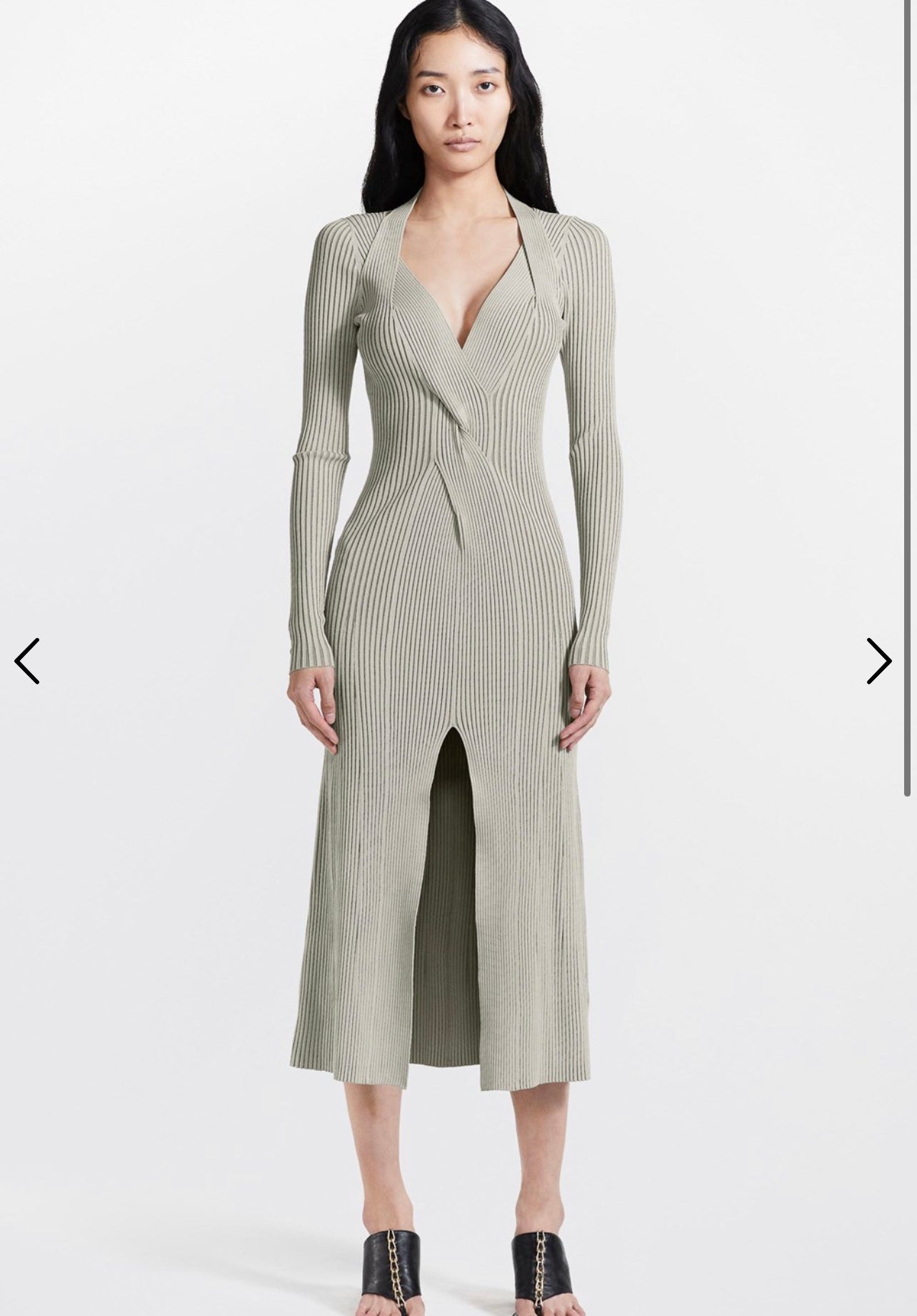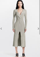 Long sleeve knit mid-length dress featuring an integrated twist detail along centre front. Cut from a comfortable ribbed knit & designed to for a slim fit. Halter neck strap detail creates a striking v neckline effect. Dress opens to a split at skirt.