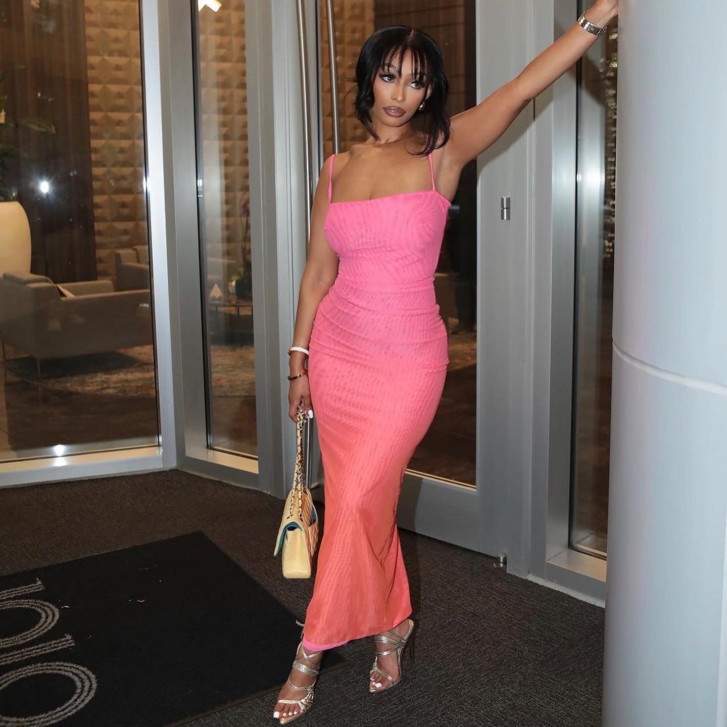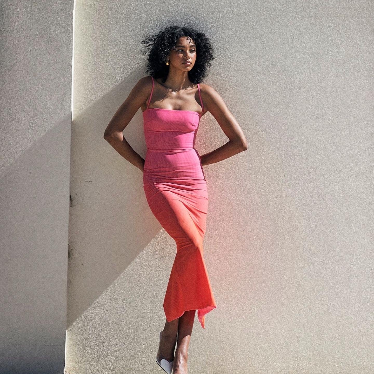The bodice features our signature corsetry boning to the sides for a structured fit and falls to a simple column silhouette with a split to the back for easy movement. 'Calista' zips up the back for easy on and we love this styled with barely there mules like 'Lucent'.