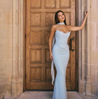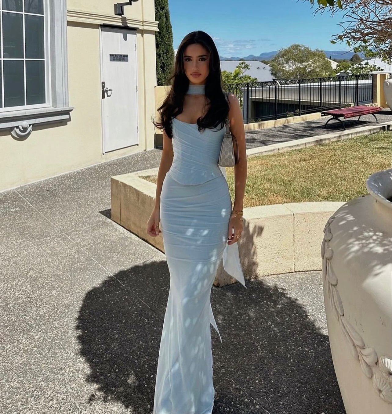Size small but can fit xs, suitable for a-d cup* fully corseted top. Zip up* Optional matching neck scarf* Stretch mesh skirt* Fluted maxi hem* Mid rise. Zip up on the side