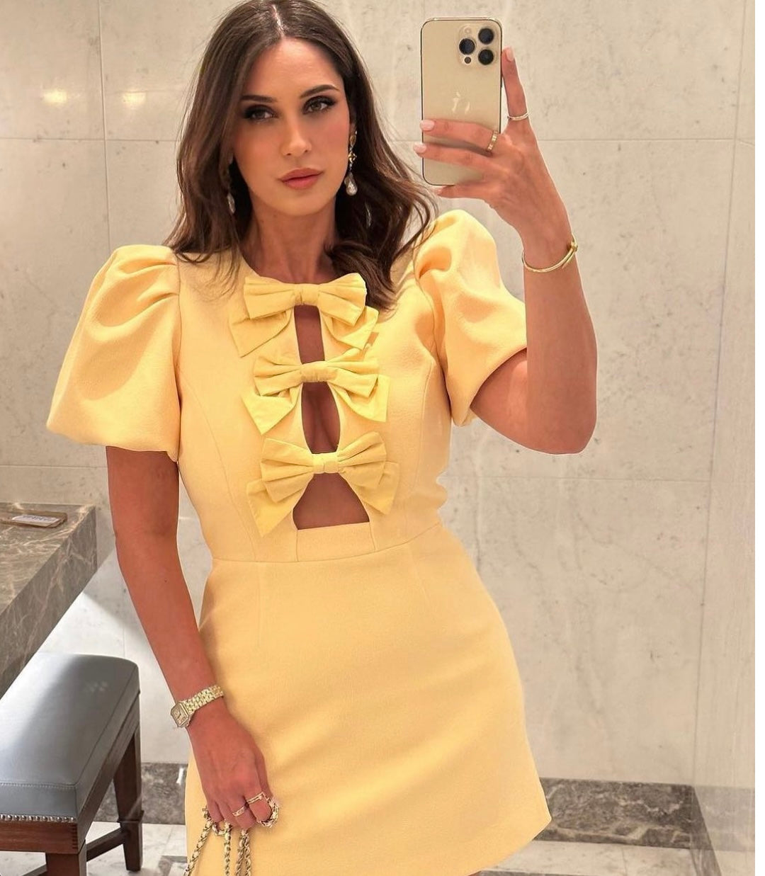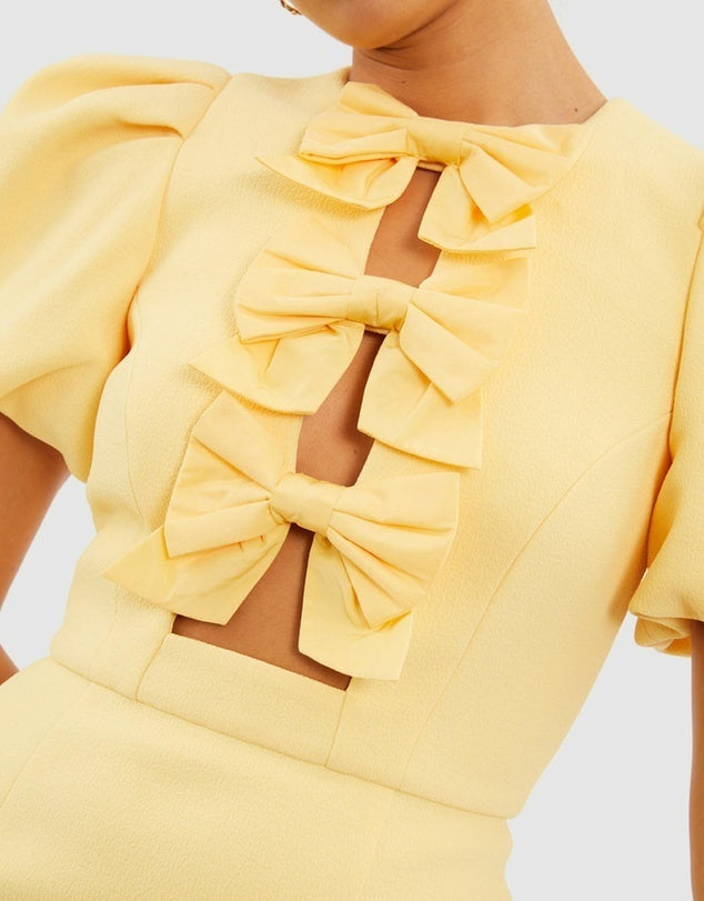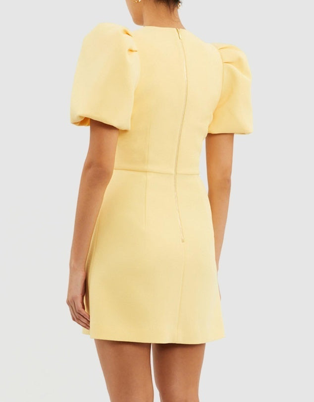 The Chloe Bow Mini Dress was designed to sit fitted at the bodice before flaring into an A-line skirt. Made from pour signature heavy-weight bonded crepe, its bodice features subtle cut outs that are hidden behind complementing taffeta bows at centre. Voluminous sleeves and a zip fastening at back complete the look. Dress is lined
