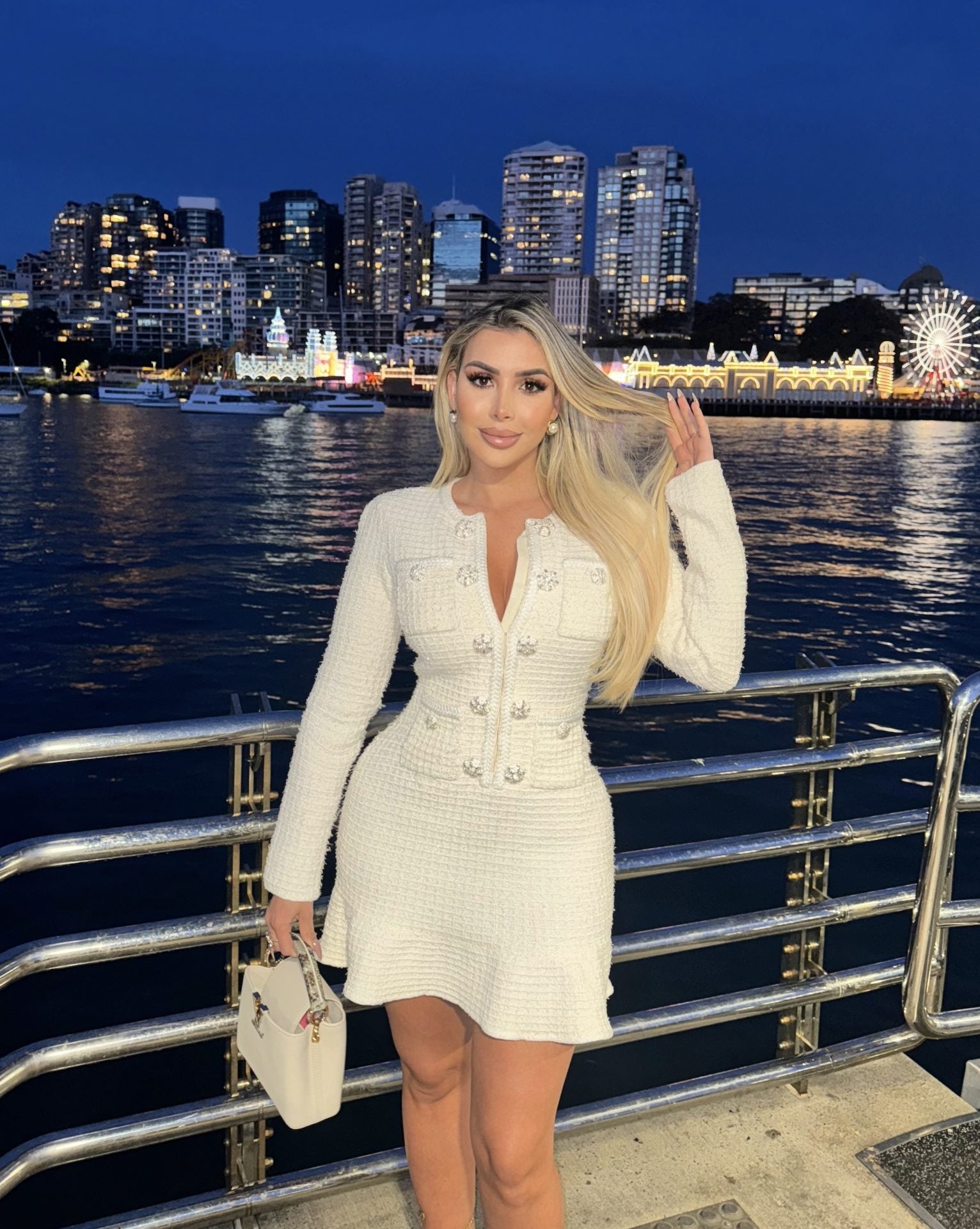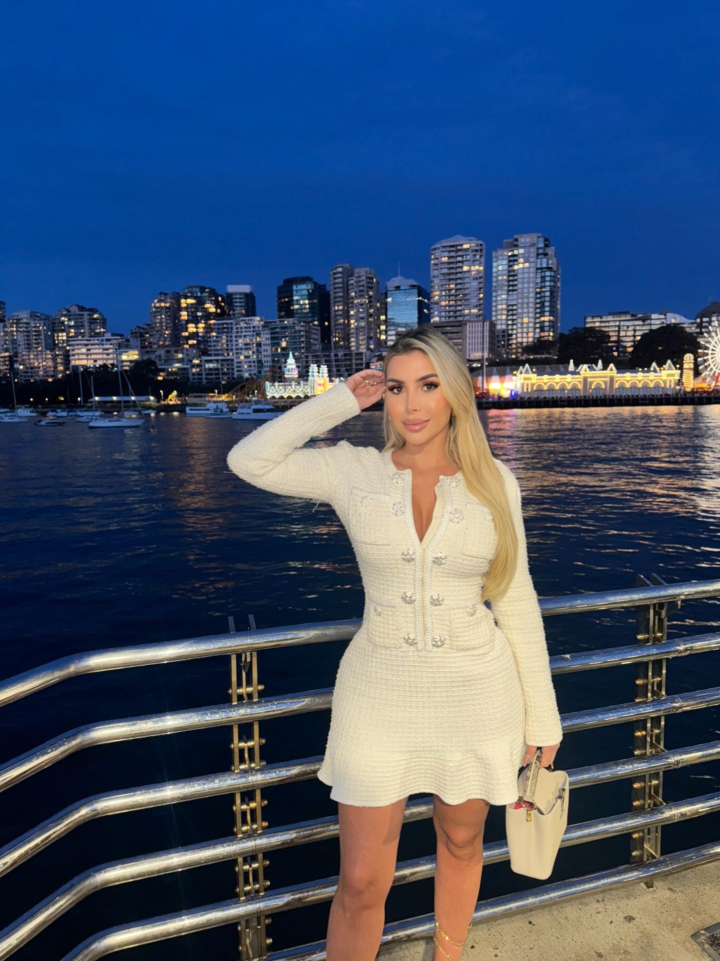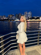 Textured knit gives this classic snow white mini — with its diamanté buttons and flared skirt — a sculpted fit and everyday ease.