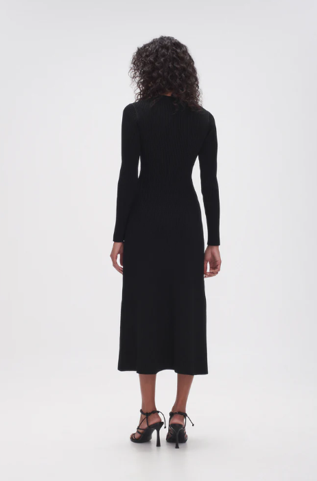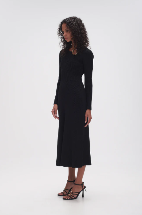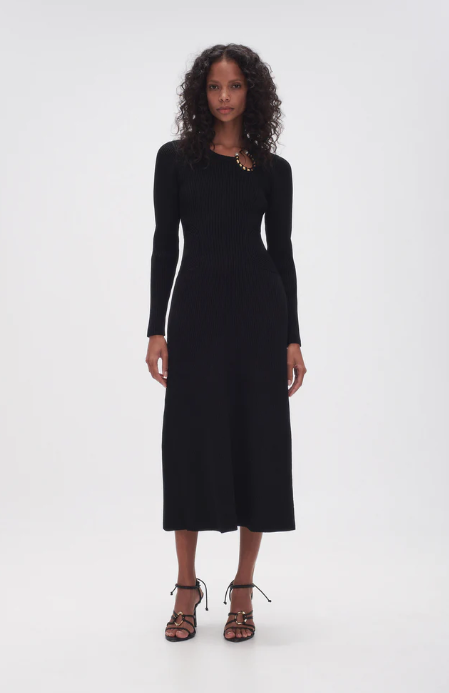 An elevated midi dress featuring a streamlined silhoeutte, innovative rib knitting, and a crew neckline adorned with pearl-flecked hardware