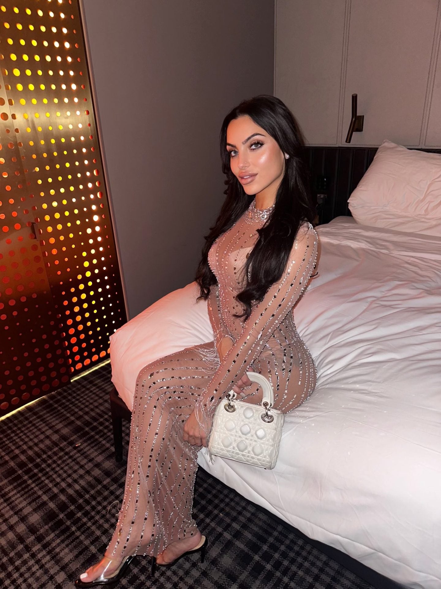 Stunning custom maxi dress with silver rhinestone detailing. Absolutely breathtaking and definetly a head turner. I will include a seamless mini dress slip underneath