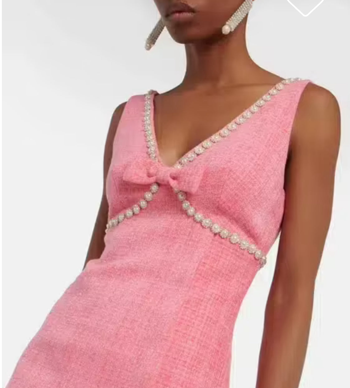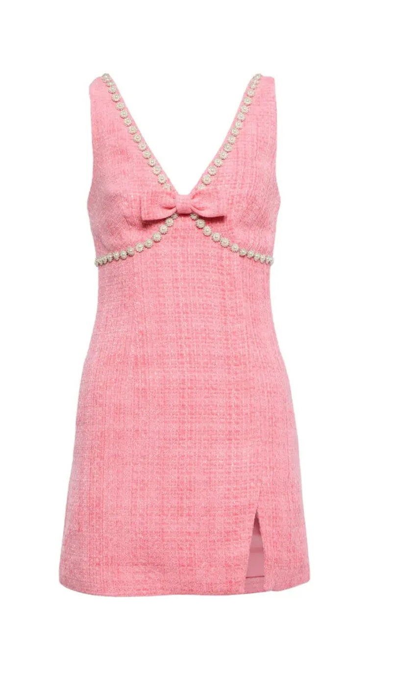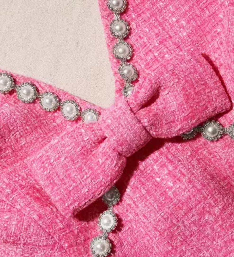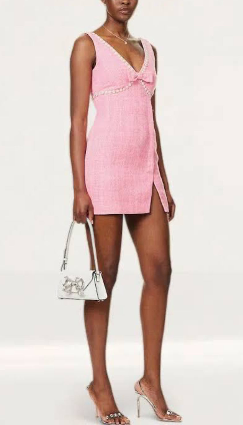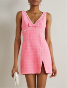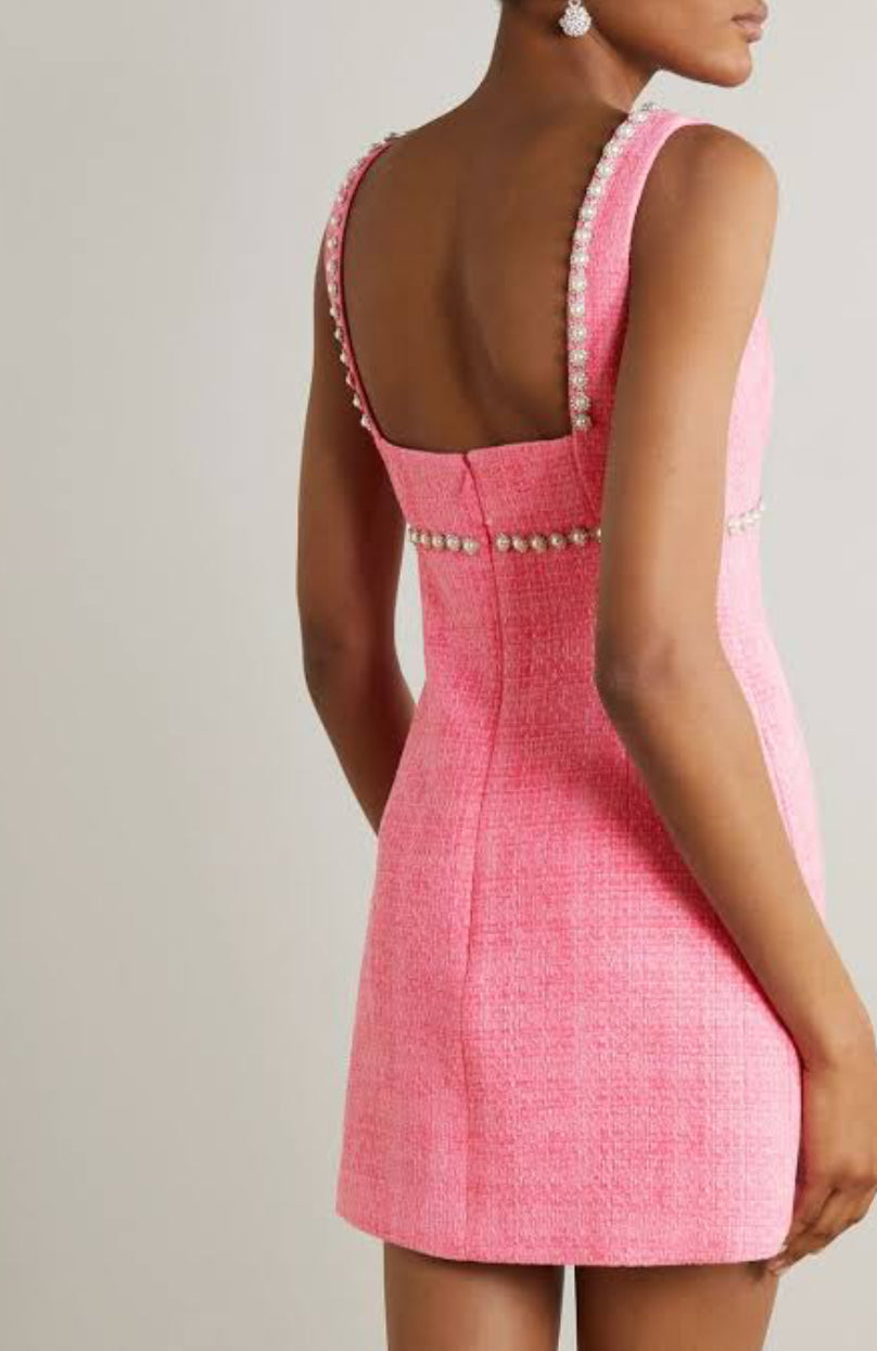 Stunning pink tweed dress with embellished detail.