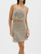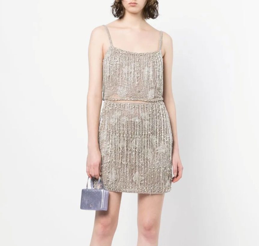 The Dante skirt and crop boasts has Intricate detailing. Complete with individually sewn string embellishments designed to catch light and move elegantly. Absolute standout show stopping piece.Can fit size 12-14