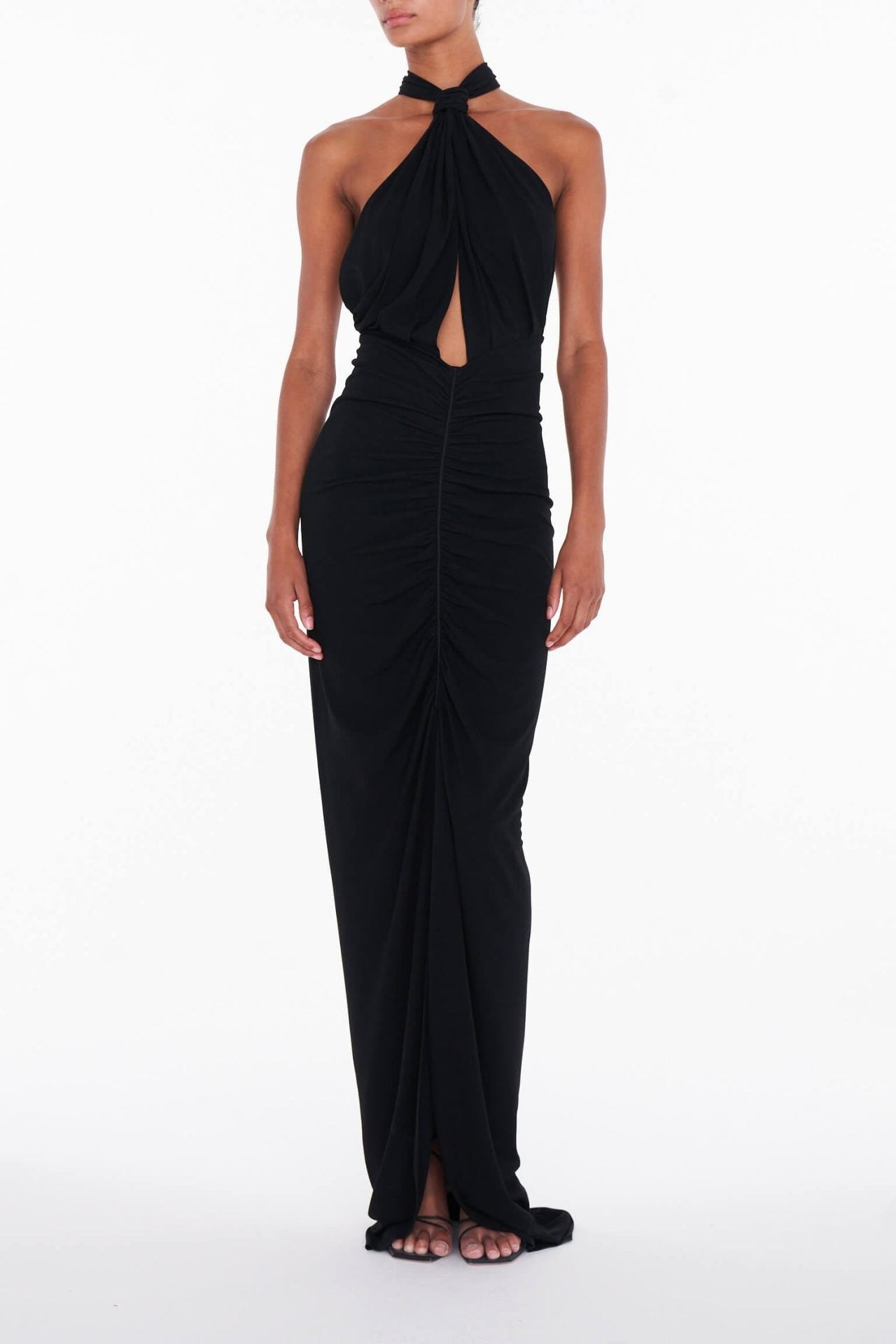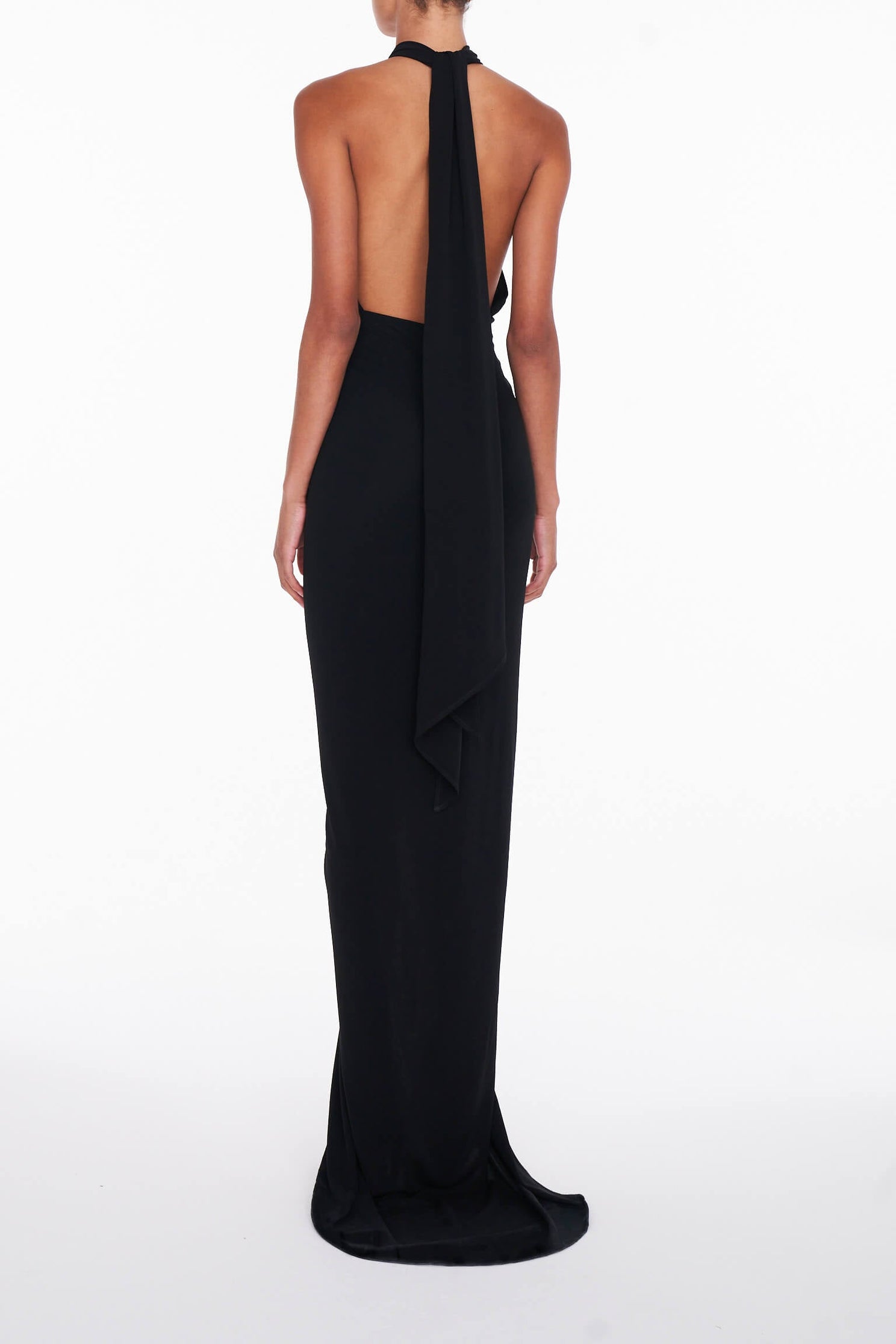 Make a dramatic statement in the Daria dress, a scene-stealing gown that mixes elegant sophistication with an air of seduction. Crafted from a luxurious stretch jersey that has been thoughtfully draped to frame and flatter, it's finished with the dark romance of an oversized floral motif set against a backdrop of fresh and zesty green. With a navel-baring cut-out and daringly scooped skirt that make it as bold as it is beautiful, it has pure glamour in its details, from the knotted scarf ties with their halter-neck lines and its backless silhouette to the way it sweeps to the floor.