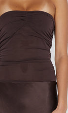 Dua Strapless Dress is an effortless yet elegant strapless maxi dress. Featuring a soft mesh bodice, that is lined at the bust and detailed by a sheer midsection. Soft gathers at the side seams enhance the silhouette, before falling into a slinky bias cut skirt at the low waist.