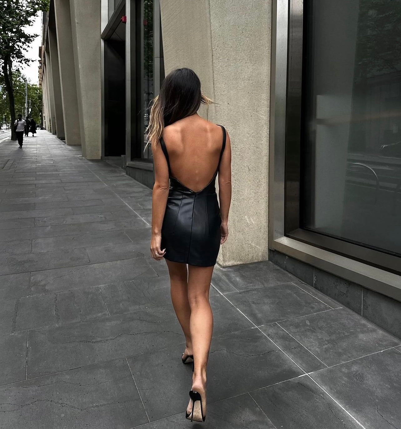 'Verona' mini dress is so evocative of '90s glamour. Made from luxurious faux stretch leather, it has the decade's defining high neckline and simplistic silhouette. Complement the dress with a statement earring and hand held clutch.Fits true to size.
