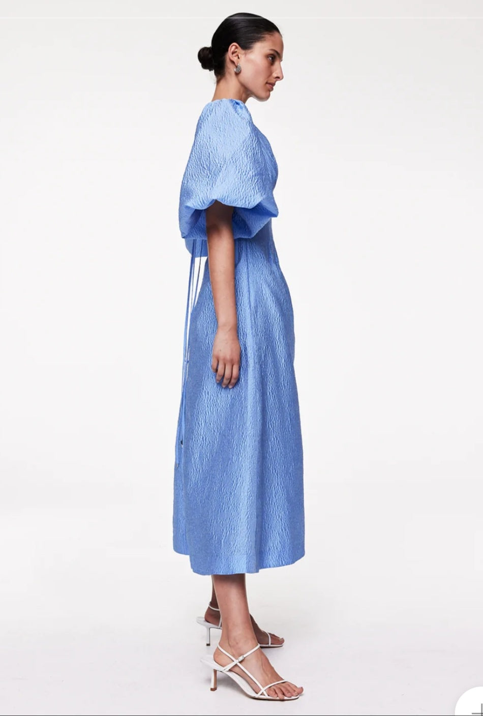 Blending shape and volume, the Emiko Dress was designed as a chic day-to-night look, cut from textured fabric featuring a corset style waist detail contrasted with voluminous sleeves and open back, falling to a flowing maxi.Relaxed fit with internal waist boning. Can also fit size 12