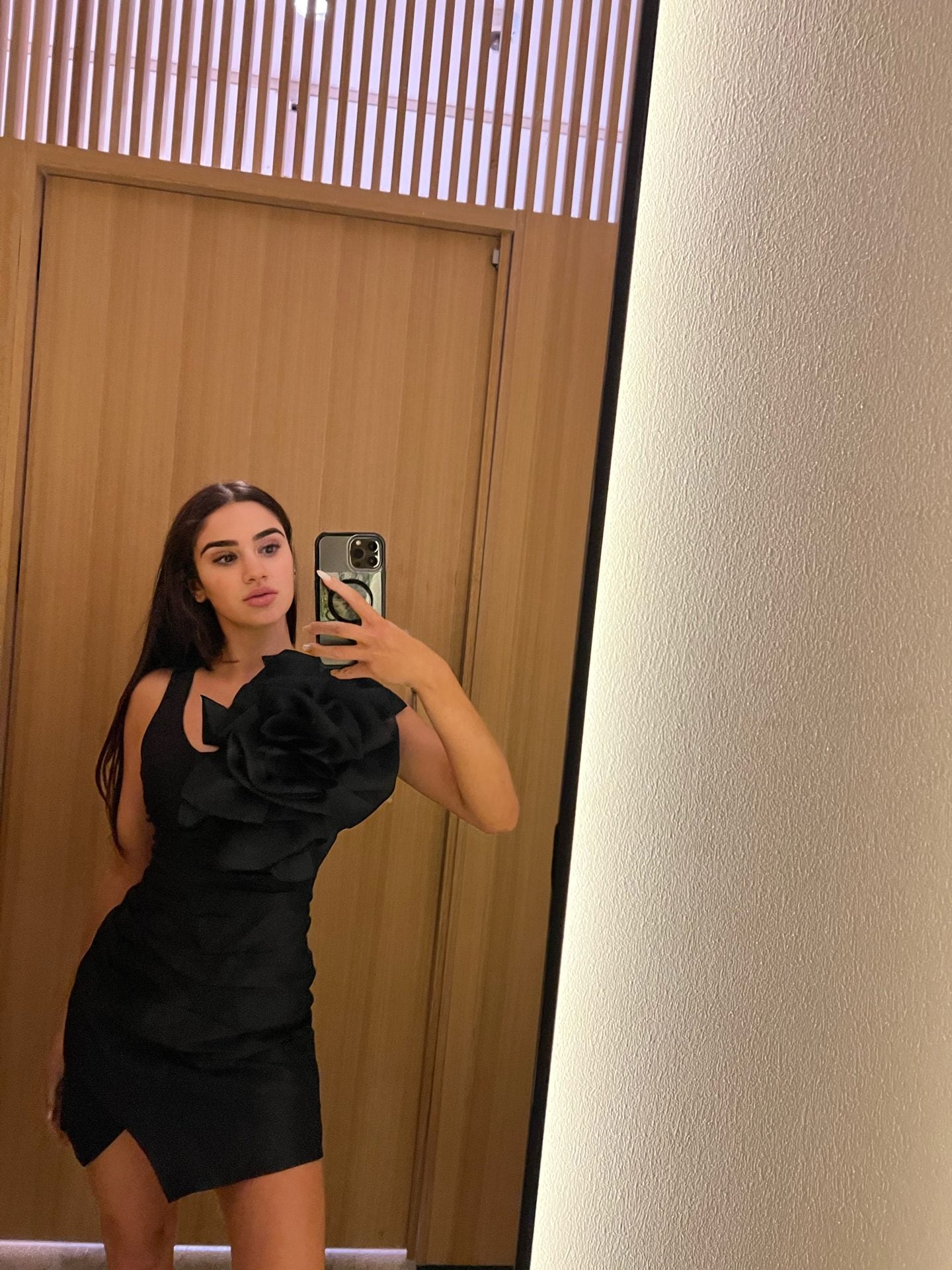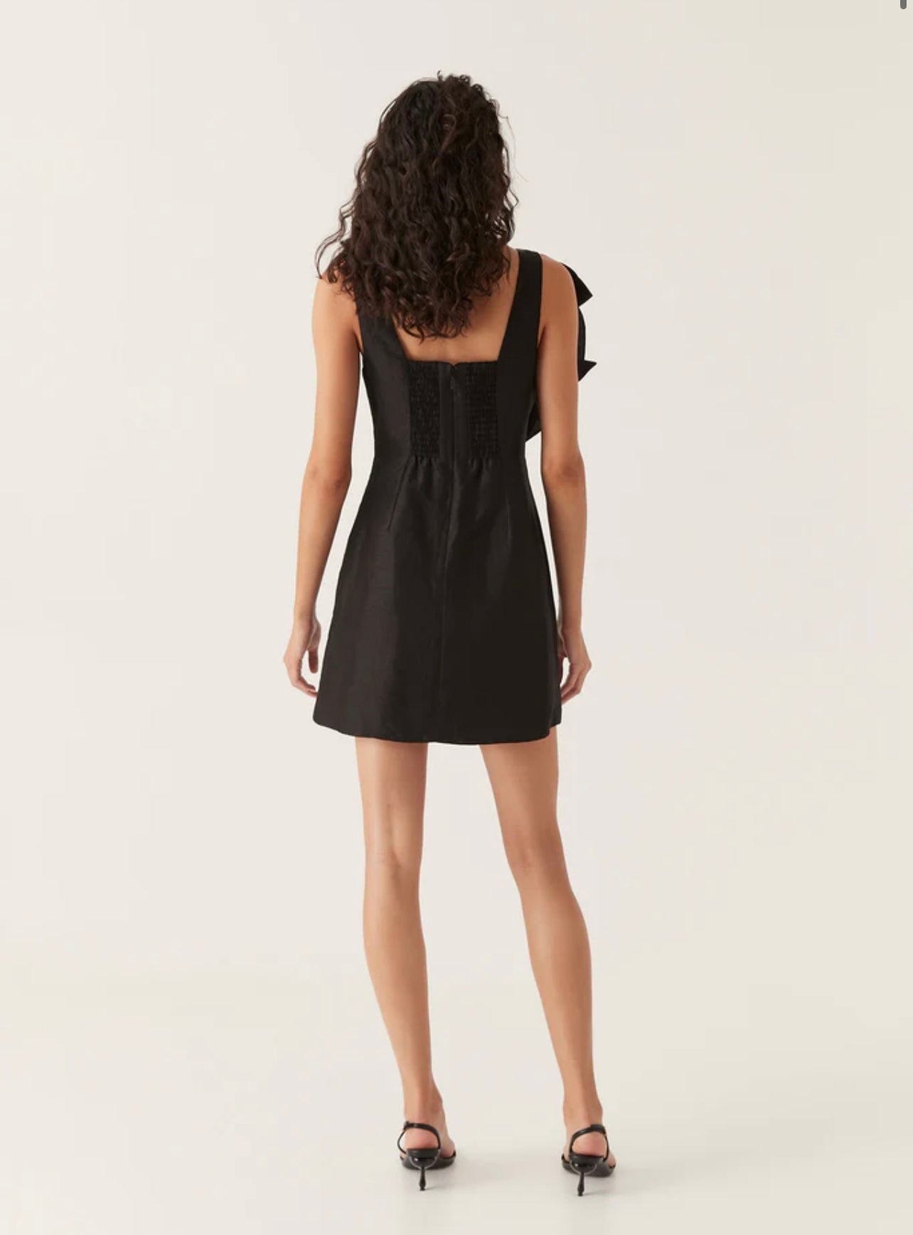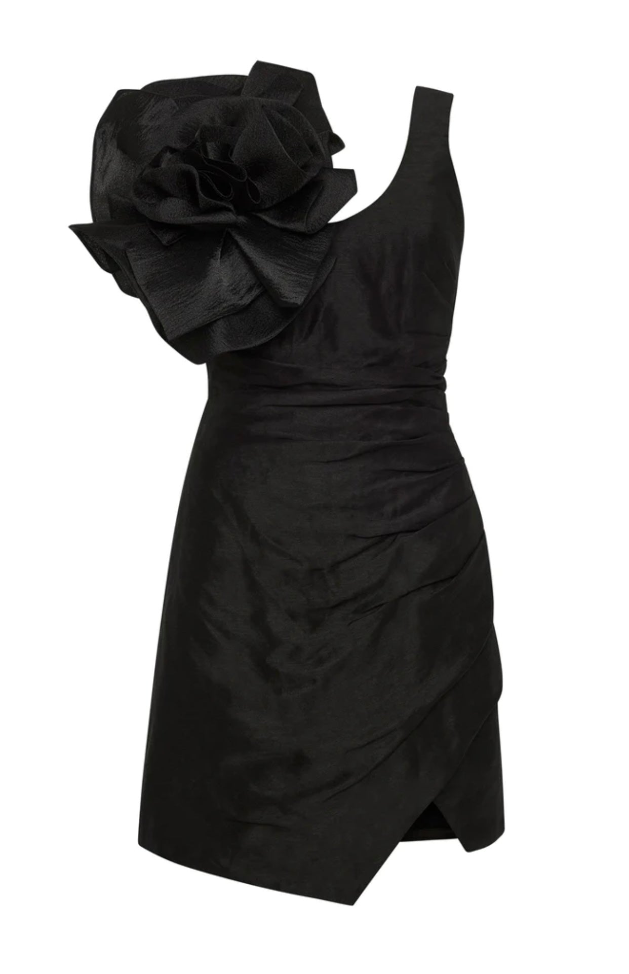"Party-perfect. The moment-making mini. "This dress can also fit a size 6Wide V-necklineTank strapsGathered organza shoulder frillFitted bodyAsymmetrical tucksAngled wrap hemZip, hook and eye closureLined