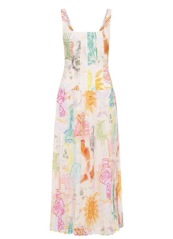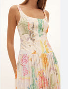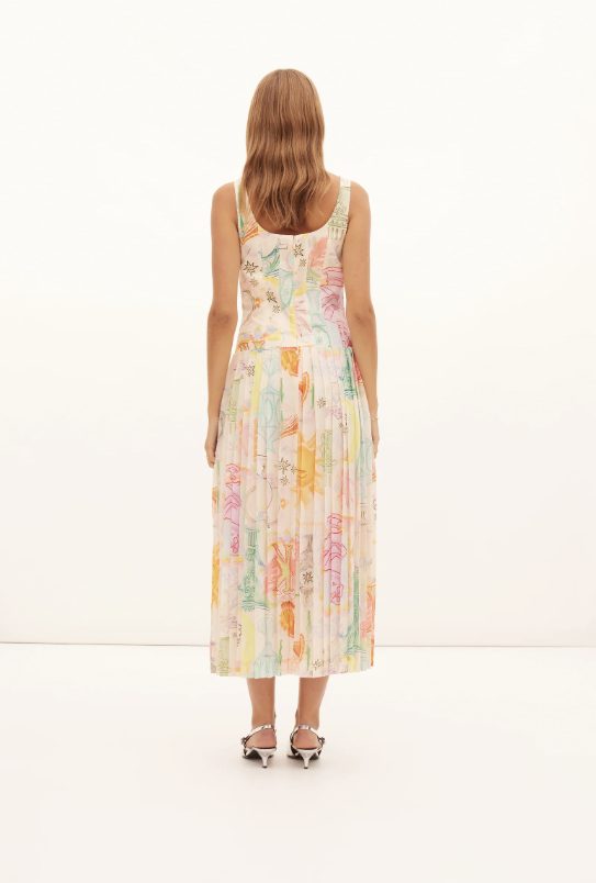 The Ethelinda Pleated Corset Dress in Solstice, is a Kate Ford exclusive hand-drawn print from her High Summer 2024 Collection, Windsor. A light weight dress with a cotton corset bodice and pleated sustainable polyester skirt, featuring a flattering boater neckline, drop waistline and pleated skirt. Finished with an invisible zip, this gorgeous dress is perfect for daytime and nighttime events.