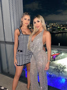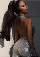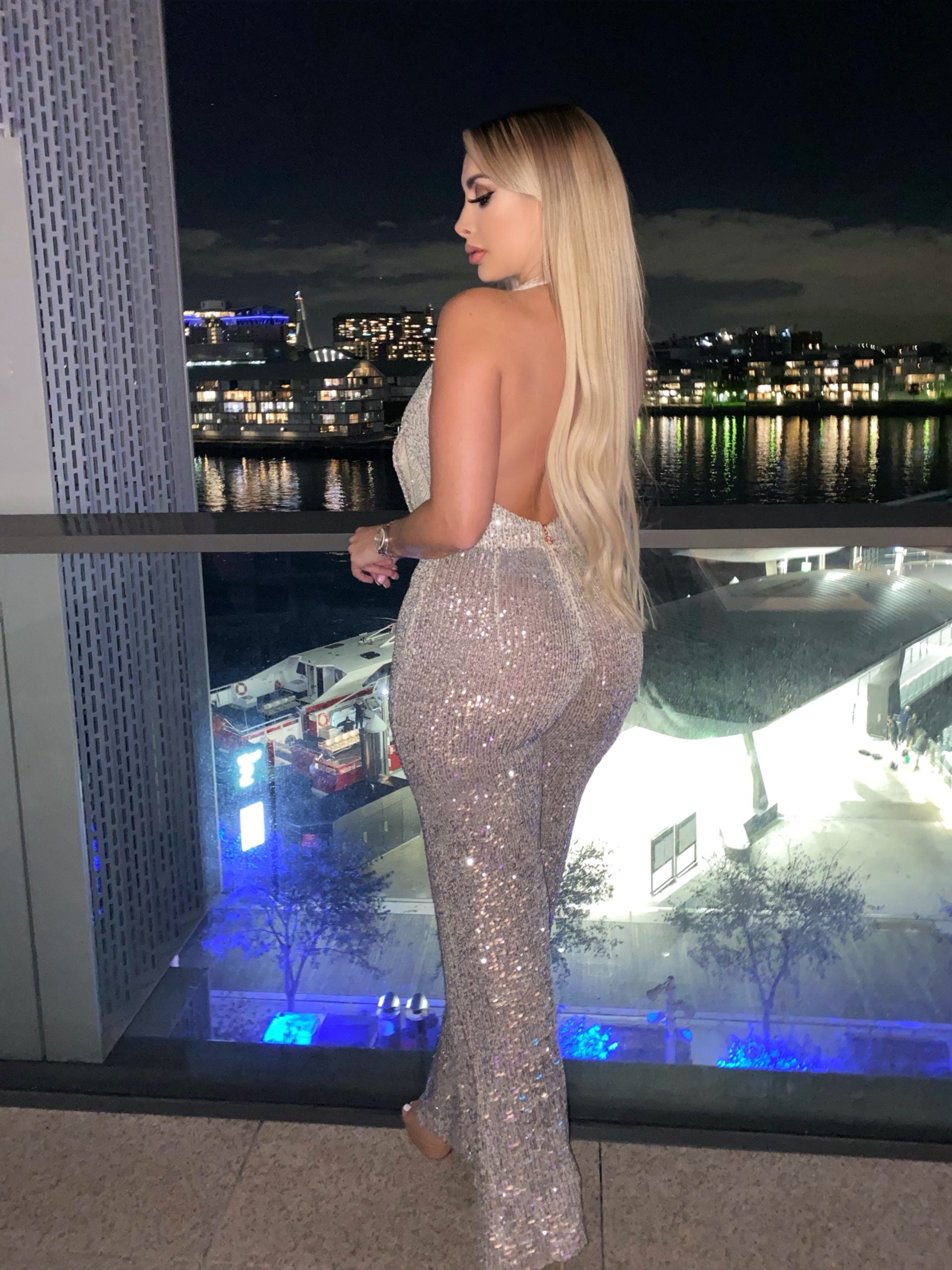 Shimmering halter style jumpsuit crafted from dazzling striped sequin. Soft draped neck line and wide leg pant. Invisible zipper at centre back with rose gold Nookie puller, button fastening at back neck..