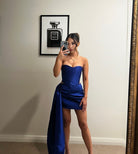 The Femme Fatale croset features a sweetheart neckline, heavy boning and zip closure. The asymmetric skirt features gentle gathers that cascades down to a floor length tail on the side.