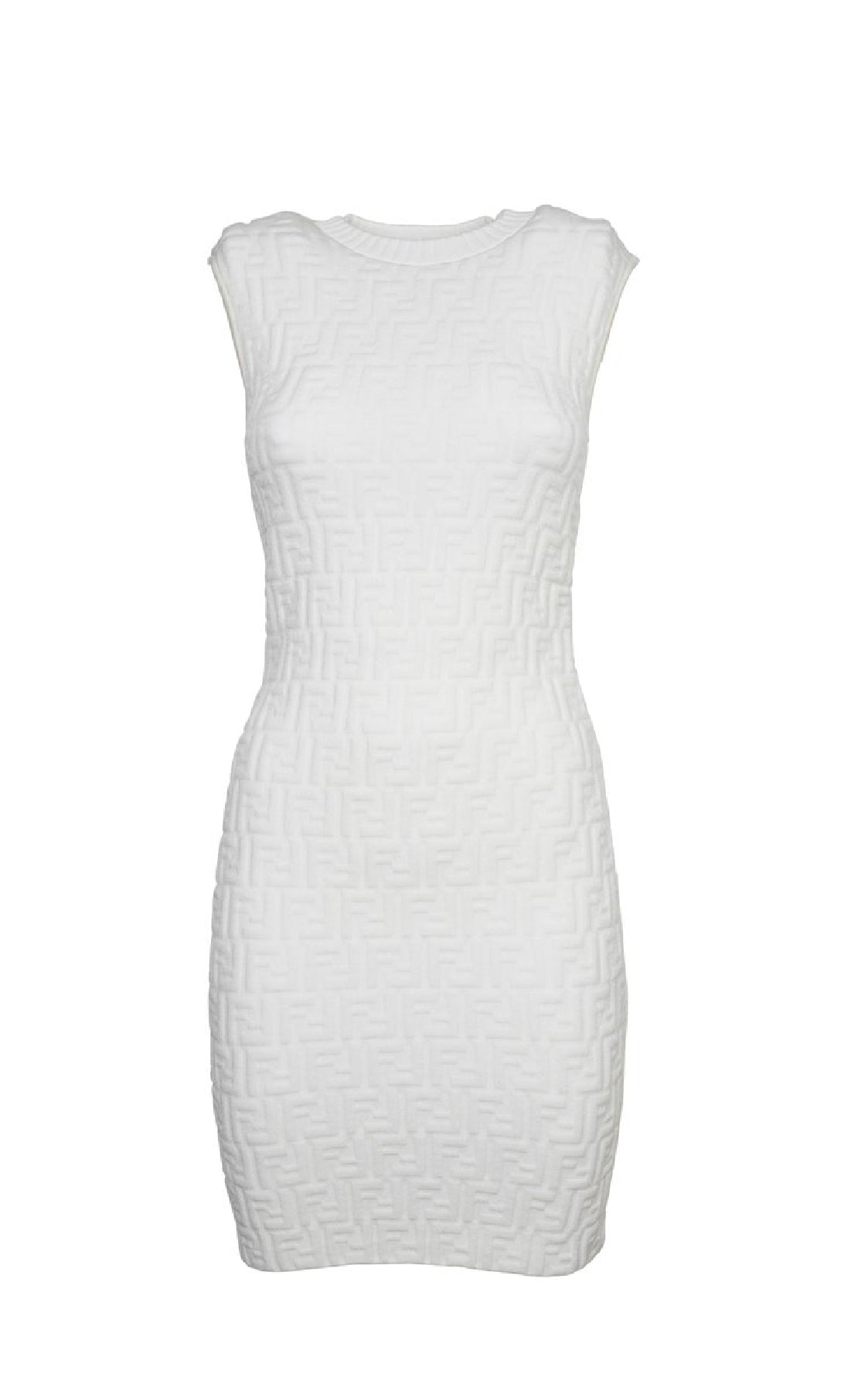 Fendi Monogram Jacquard Sleeveless Dress White Size AU 6Artistic Director Kim Jones digs into the Fendi archives with this 90s-style mini dress. It's emblazoned with the house's iconic 'Zucca' motif throughout. The fabric hugs your form for a striking silhouette that's matched by the thigh-skimming hem length.