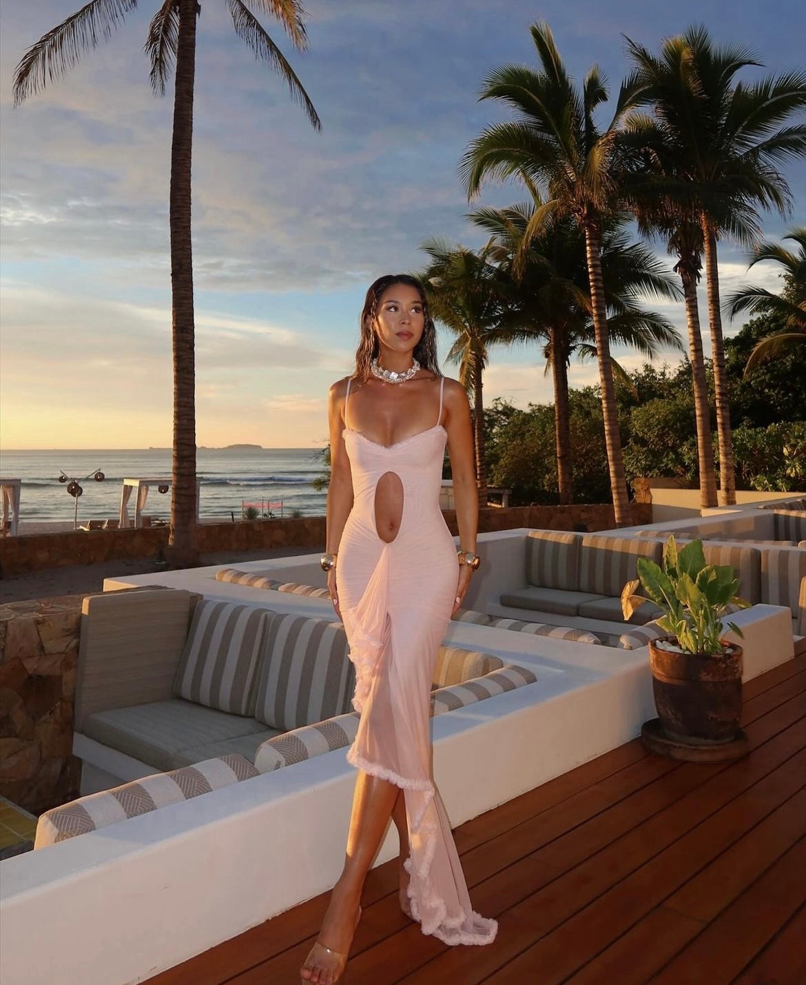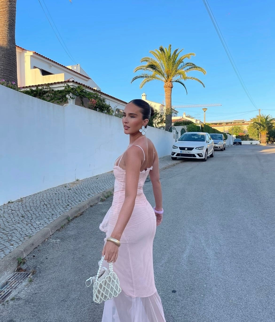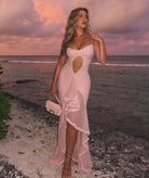 Our 'Gabriella' gown is reminiscent of glamorous vintage styles with its beautiful silhouette and flirtatious ruffled design. It's detailed with the most delightful touches to make you feel elegant and glamorous for those special occasions.The perfectly placed hip gathers cinch your figure and the playful waterfall front is edged in the prettiest ruffles. The floaty hem extends out to a train at the back to trail beautifully behind as you walk. It zips to the back for easy on and looks ultra feminine with vertiginous heels that peak from below the hem as you walk.