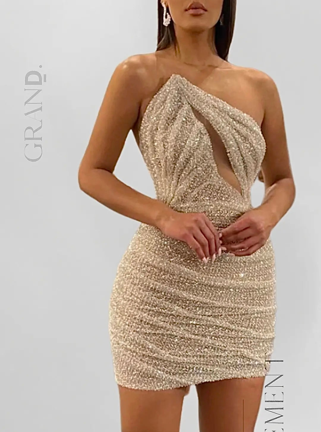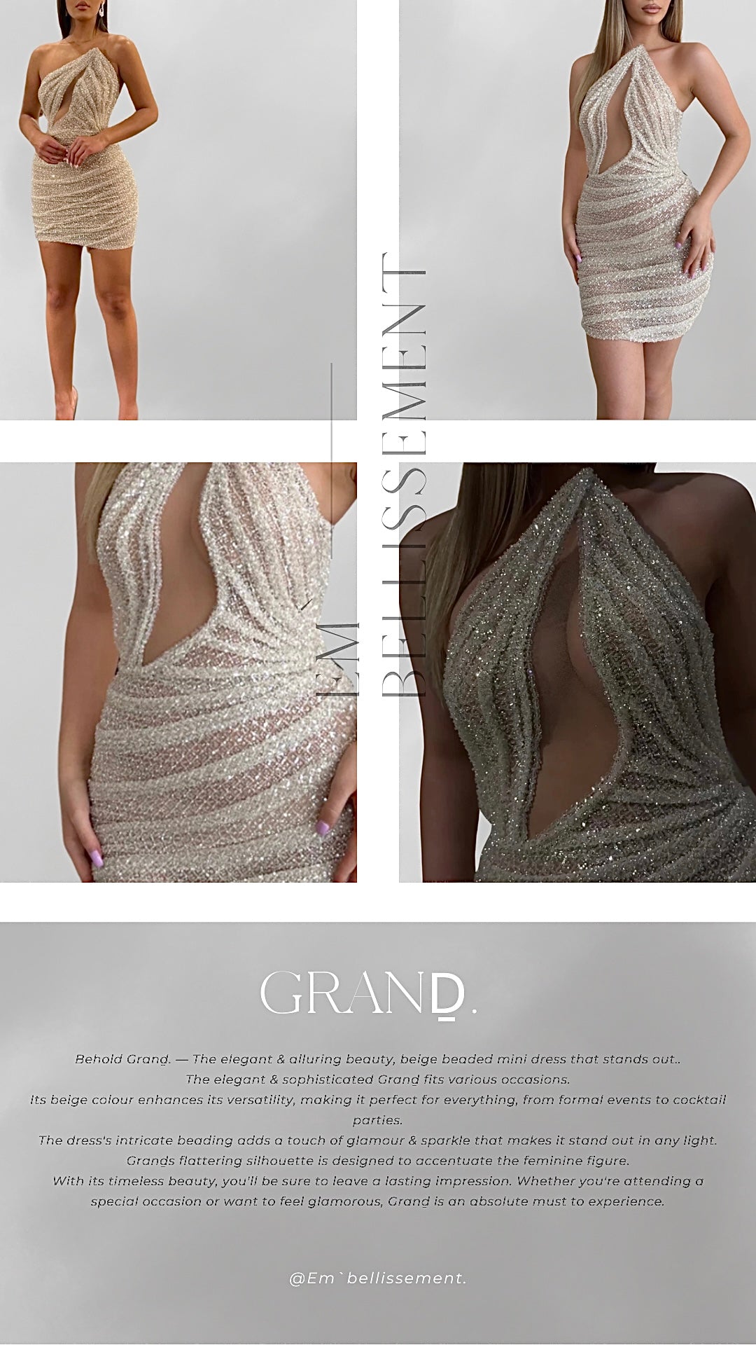 Behold Grand. - The elegant & alluring beauty, beige beaded mini dress that stands out..The elegant & sophisticated Grand fits various occasions.Its beige colour enhances its versatility, making it perfect for everything, from formal events to cocktail parties.The dress's intricate beading odds a touch of glamour & sparkle that makes it stand out in any light.Grands flattering silhouette is designed to accentuate the feminine figure.With its timeless beauty, you'll be sure to leave a lasting impression. Whether you're attending a special occasion or want to feel glamorous, Grand is an absolute must to experience.