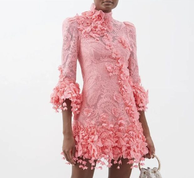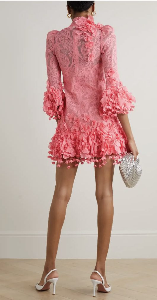 This High Tide minidress embodies Zimmermann’s sense of playful sophistication. The floral lace construction combines with the ruffled detailing throughout to create an airy and romantic aesthetic which is enhanced by the brand’s ‘Guava pink’. Pair with metallic or white accessories to complete your chic look for your event.
